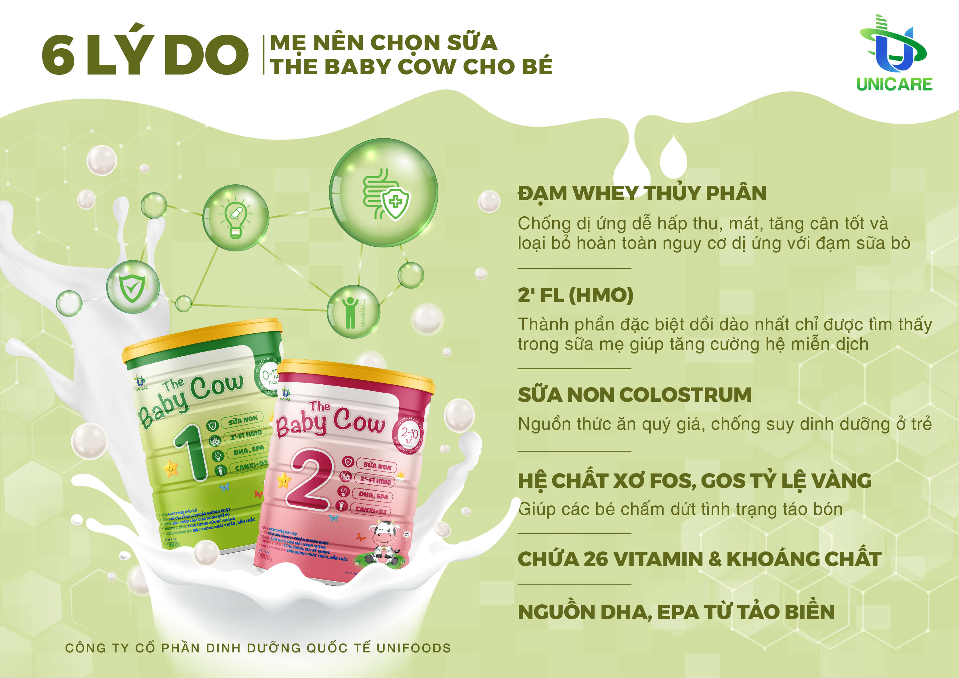 Sữa Non The Baby Cow 1 - đảm bảo tiêu chuẩn lựa chọn dinh dưỡng từ sữa bổ sung Tiêu chí đầu tiên thường được phụ huynh lựa chọn là yếu tố mang đến "nguồn dinh dưỡng tốt lành cho trẻ" và "niềm an tâm cho cha mẹ". The Baby Cow 1 một sản phẩm từ Công ty cổ phần dinh dưỡng quốc tế Unifoods. Sản phẩm được FDA - Cục quản lý Thực phẩm và dược phẩm Hoa Kỳ chứng nhận đủ điều kiện an toàn. Trong Sữa non The Baby Cow có chứa chất gì? Lúc đầu mua về thì cũng thầm nghĩ, thành phần chắc chắn là chứa sữa non rồi, nhưng điều làm mình bất ngờ đó là hàm lượng cực cao luôn, lên đến 1.000.000 mcg - lọt top những sữa non có chứa kháng thể cao nhất, vô cùng yên tâm về tác dụng tăng đề kháng luôn. Sau đó khi nghiên cứu kỹ bảng thành phần, mình thấy càng ưng ý hơn khi sữa chứa các chất như: ● Kháng thể lactoferrin: Một loại kháng thể kỳ diệu có trong sữa mẹ, nhưng chỉ duy trì đến hết 9 tháng đầu đời nếu trẻ bú mẹ hoàn toàn. Kháng thể này tạo hàng rào bảo vệ tự nhiên, giảm mắc các bệnh về đường hô hấp ● Dinh dưỡng 2Fl'HMO: Thành phần dinh dưỡng đứng thứ 3 trong sữa mẹ, tỷ lệ chất này trong The Baby Cow ngang ngửa sữa mẹ bình thường chứ không đơn thuần là sữa công thức nữa. Không chỉ cung cấp năng lượng, HMO còn tăng mức hấp thu dinh dưỡng tại ruột và tăng đề kháng cho con. ● Chất xơ GOS/FOS tỷ lệ vàng 9:1: Chất xơ hòa tan cải thiện tốt các vấn đề tiêu hóa của con như táo bón, đầy bụng, ăn không tiêu. Tỷ lệ 9:1 đã được tính toán để phù hợp, đảm bảo cải thiện việc ăn uống. ● Chiết xuất EPA - DHA từ tảo biển: Có nguồn gốc từ tự nhiên nên cực kỳ an toàn với trẻ nhỏ, giúp mắt sáng và trí não thêm thông minh. ● Bộ ba Canxi - Vitamin D3 - MK7: Đây được ví như những chất kết nối xây lên hệ xương vững chắc và phát triển chiều cao cho con. Nếu thiếu đi vitamin D3 và MK7 thì cơ thể gần như không thể hấp thụ Canxi Công dụng nổi trội của sữa non The Baby Cow: -Chắc hẳn nghiên cứu xong những thành phần phía trên, các mẹ cũng đoán được những tác dụng nổi trội của sữa The Baby Cow rồi đúng không? Để mình liệt kê lại cho mẹ tiện theo dõi nhé: ● Cung cấp năng lượng phù hợp với lứa tuổi trẻ dưới 1 tuổi, đặc biệt phù hợp thay thế sữa mẹ ở những mẹ ít sữa ● Củng cố thêm hệ miễn dịch đầu đời vốn dĩ rất mong manh ở trẻ, giảm đi nguy cơ mắc các bệnh nguy hiểm ● Giải quyết các vấn đề đường ruột hay gặp như táo bón, đầy hơi, nôn trớ… ● Cho cơ thể bé khỏe mạnh từ bên trong từ trí não đến vận động, tăng trưởng cả cân nặng lẫn chiều cao Nhất là các bé đang trong tình trạng lười ăn, ăn hoài không tăng cân, thấp bé nhẹ cân… thì mẹ cho bé sử dụng càng sớm càng tốt nha.