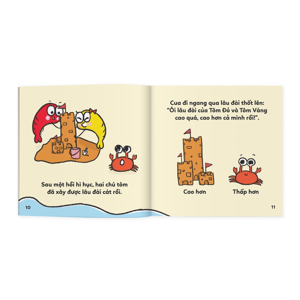 - "Cao thấp" là câu chuyện về 3 chú tôm: Tôm Xanh, Tôm Đỏ, Tôm Vàng rủ nhau thi xây lâu đài cát. Ai cũng nỗ lực để dành phần thắng về đội mình. Quá trình và kết quả xây lâu đài của ba chú tôm giúp bé học được phép so sánh: CAO – THẤP.