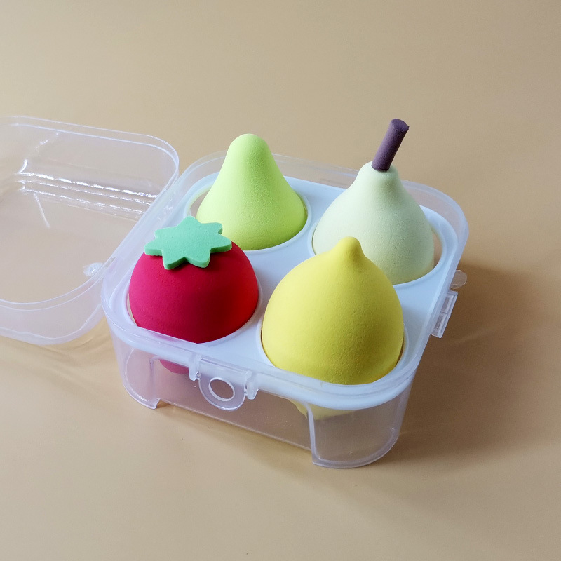 -Mút trang điểm 4 món hình quả trứng trái cây , bông tán phấn nhiều màu có hộp đựng , xinh xắn siêu đáng yêu cute -Xuất xứ : Trung Quốc -Chất liệu : cao