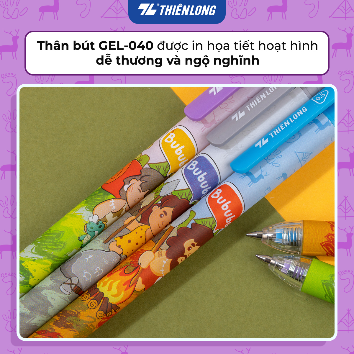 Tính năng nổi bật: Bút gel có thiết kế đơn giản và hiện đại. Thân và nắp bút bằng nhựa trong, sáng bóng sang trọng. Đặc biệt thân bút có những họa tiết nhân vật