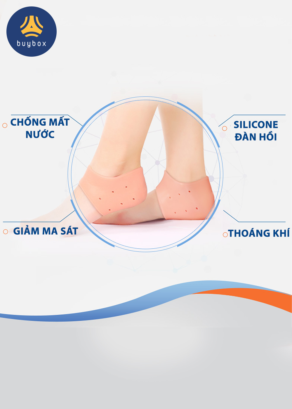 - Mang vớ bọc gót silicone vào bàn chân sao cho ôm vừa vặn phần gót chân. "buybox - NGƯỜI BẠN THÂN CỦA ĐÔI CHÂN"