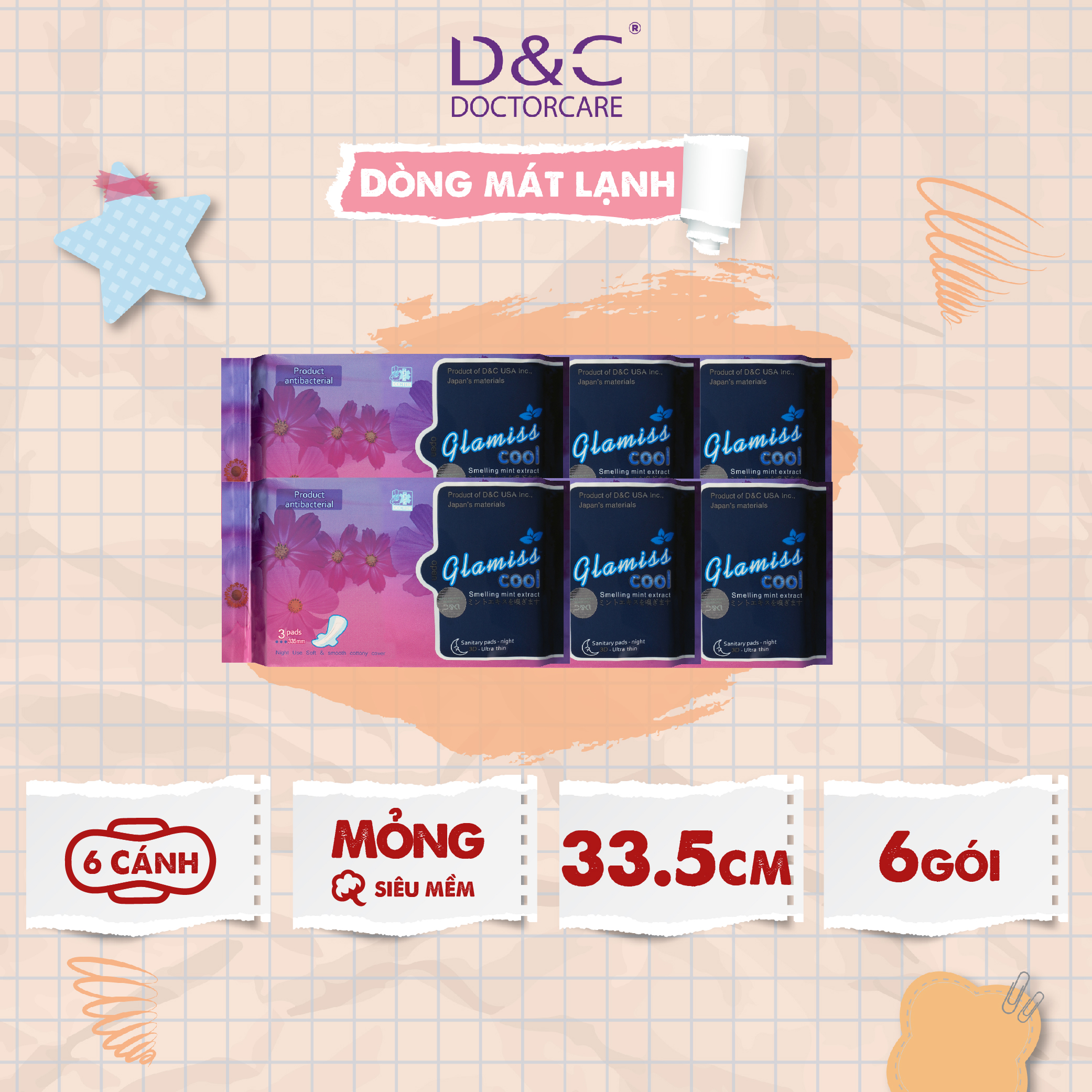 - Đóng gói: [6 Gói x 03 miếng] ĐẶC ĐIỂM NỔI BẬT BĂNG VỆ SINH BAN ĐÊM GLAMISS COOL