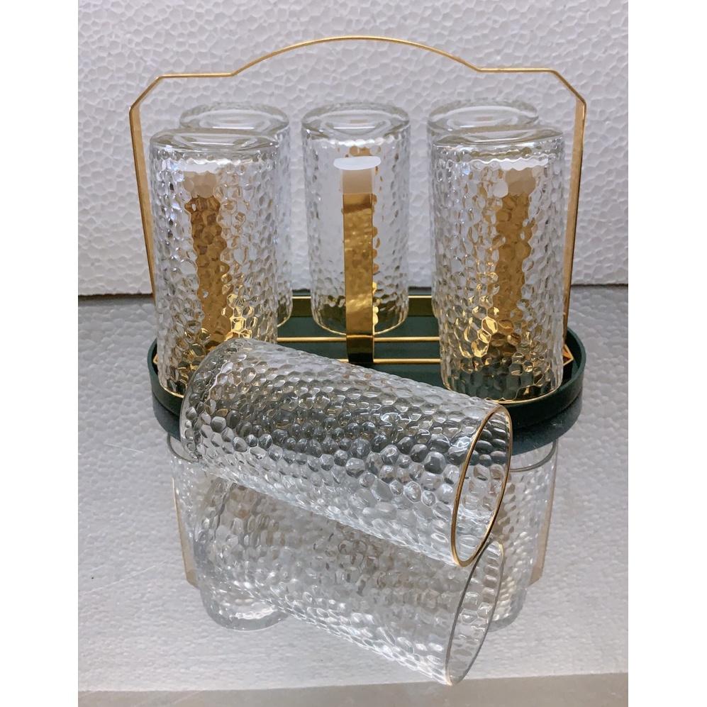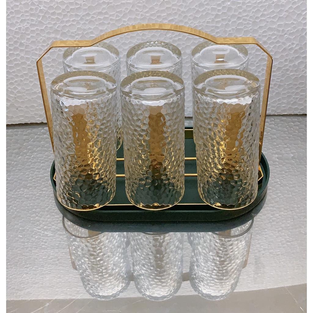 ✨Combo 6 cốc ống thủy tinh uống nước chịu nhiệt cao cấp vân sần kèm giá úp cốc có khay hứng nước ngọng vàng
