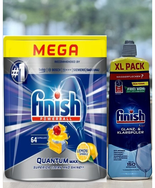 Combo: Viên rửa bát Finish 64 viên +Muối rửa bát finish 1.5kg cho Máy rửa bát chén là bộ 3 sản phẩm đầy đủ chức năng nhất hiện nay Là combo chất tẩy rửa "Đơn giản và Hiệu quả", thương hiệu của CHLB Đức Viên rửa bát Finish 64 viên: là viên rửa bát Trọng Lượng Nhỏ 5g. Tuy nhiên đối với những vùng có nước nặng, nhiều kim loại, hãng Finish khuyến cáo nên sử dụng thêm sản phẩm Muối làm mềm nước và bóng để bảo vệ máy khỏi cặn vôi giúp nâng cao tuổi thọ của máy rửa bát. Viên rửa bát Finish 64 viên chuyên dùng cho máy