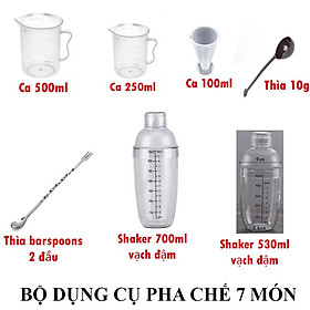 ✨Combo bộ dụng cụ pha chế 7 món (ca 500-250-100ml, thìa nâu 10g, thìa khuấy inox, shaker 530-700ml)