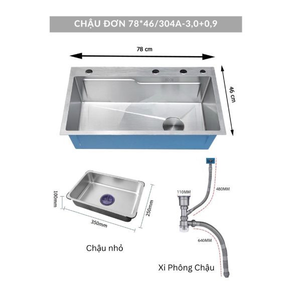 Chất liệu: Inox 304 Màu sắc" Inox mờ Bảo hành 24 tháng  Chế tạo khuôn ép nguyên tấm 100% Bộ lọc rác inox 304, xi phông nhựa PP cao cấp  Không tiếp xúc trực tiếp
