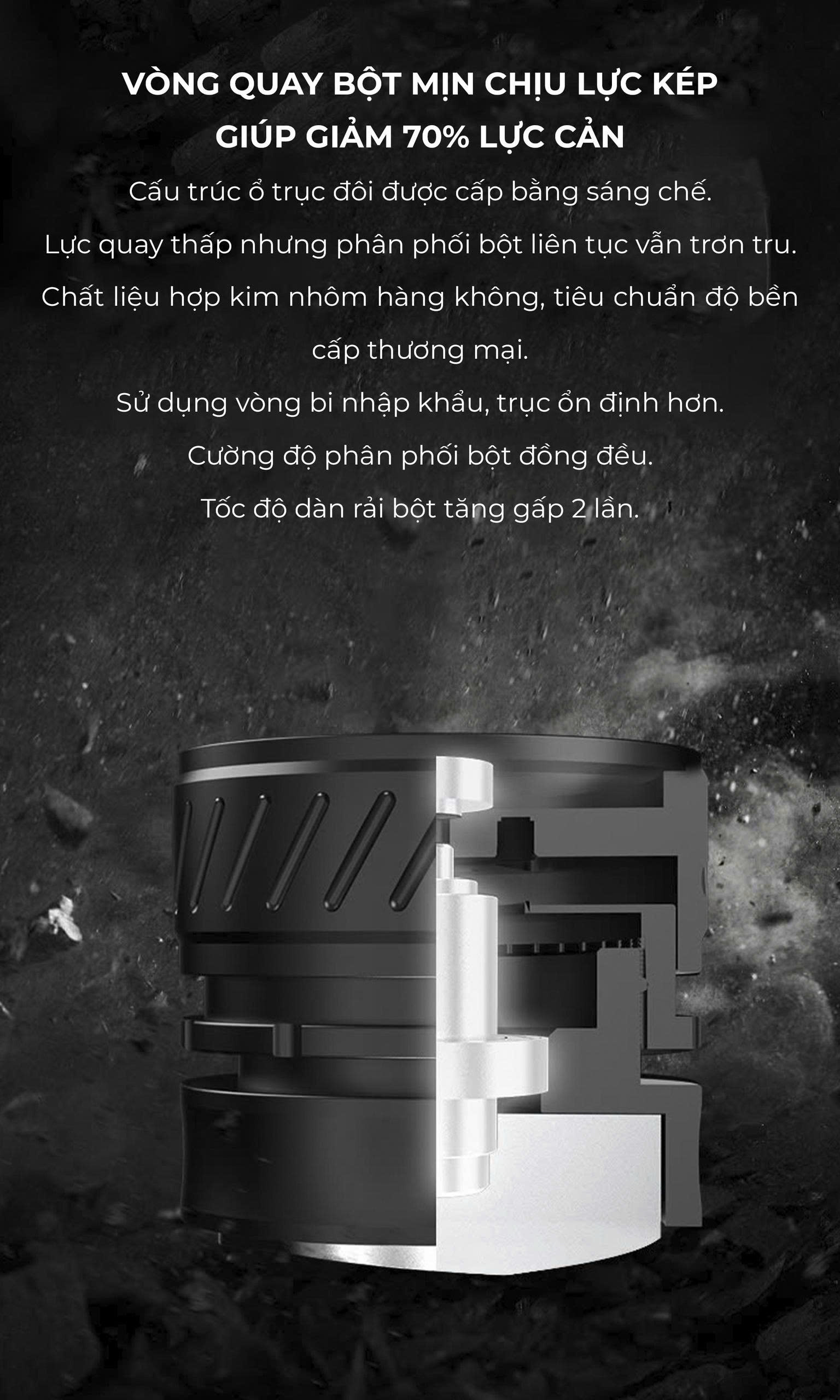 - Kim xoay tán đều bột THOR • Xoắn ốc đều tay – đĩa kim quay tròn khi ấn • Phân bổ bột đồng đều, không vón cục