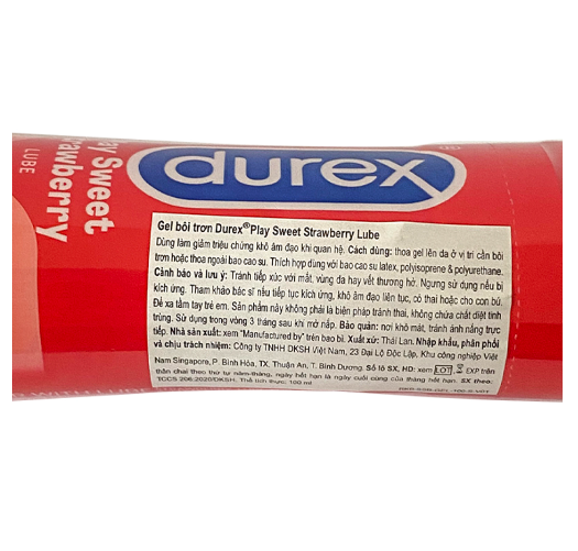 - Durex Play Strawberry nhập khẩu Thái Lan là sản phẩm bôi trơn đang được rất nhiều người tin dùng đến từ thương hiệu nổi tiếng Durex. Chất bôi trơn Durex Play Strawberry dạng gốc nước với mùi dâu tây ngọt nào quyến rũ giúp cuộc yêu đôi bạn thăng hoa, đem lại không khí mới lạ cho đôi bạn. Gel Durex Play Strawberry 100ml Chi tiết Gel bôi trơn Durex Play Strawberry:
