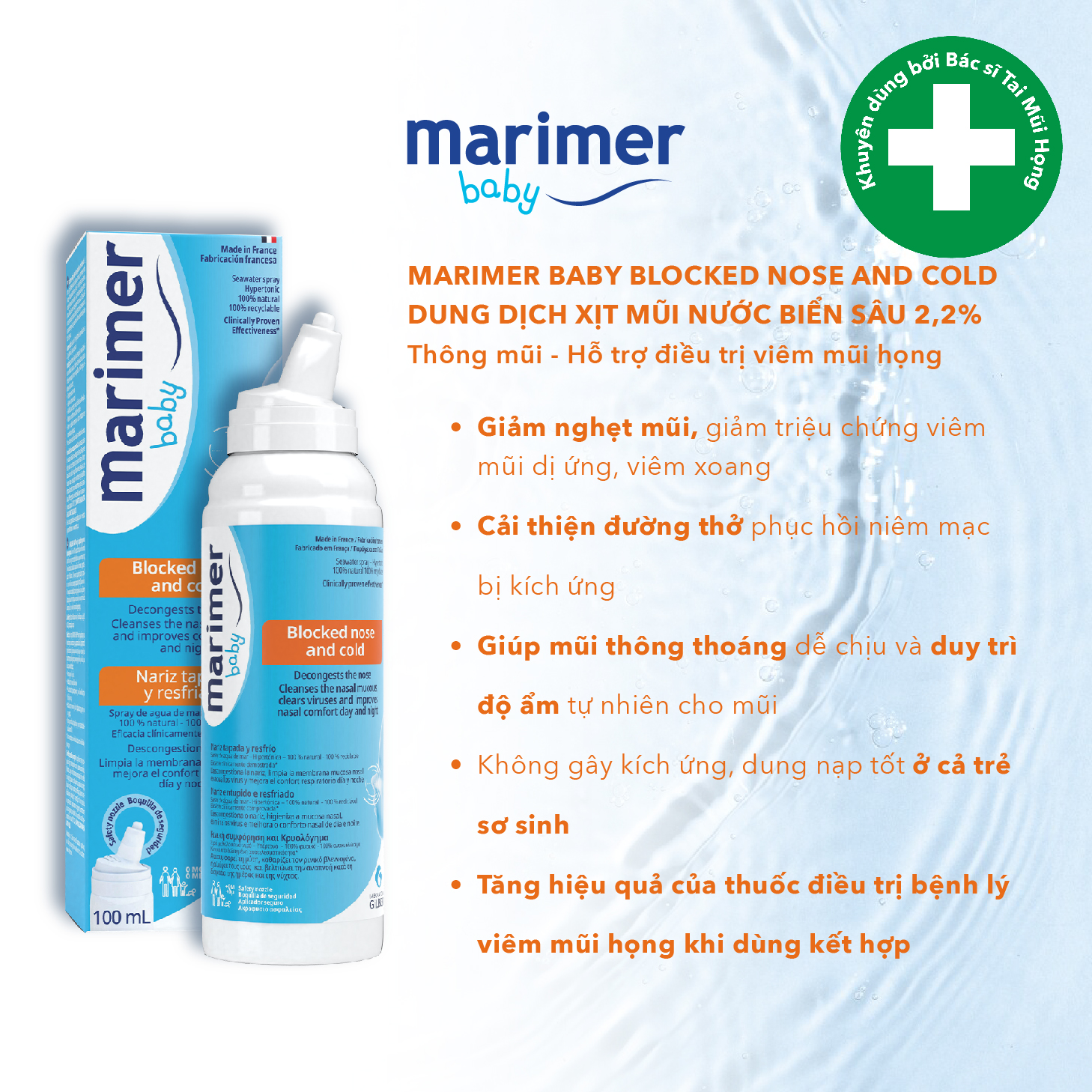 - MARIMER BABY BLOCKED NOSE AND COLD Dung dịch xịt mũi làm thông mũi, giảm nghẹt mũi, hỗ trợ giảm cảm cúm, viêm mũi họng Dành cho trẻ sơ sinh THÀNH PHẦN: Nước biển ưu trương, nước tinh khiết. CHỈ ĐỊNH: Dành cho trẻ sơ sinh, khi có các triệu chứng bệnh lý tai mũi họng:
