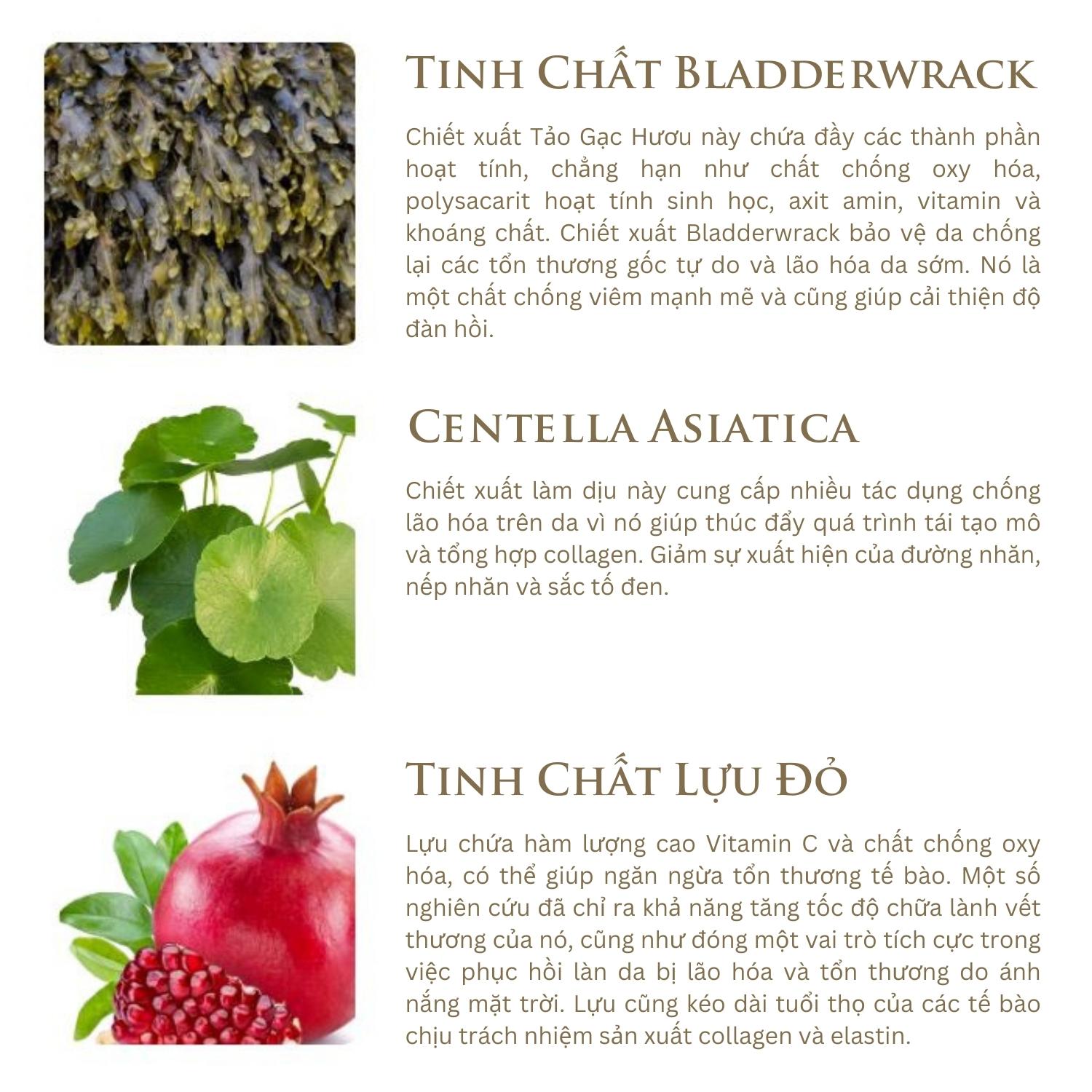 - Thành phần: Dưỡng trắng da, tái tạo collagen giúp đều màu da, giúp da luôn trắng mịn và se khít lỗ chân lông. Ngăn ngừa lão hoá da, phục hồi nhanh tình trạng da