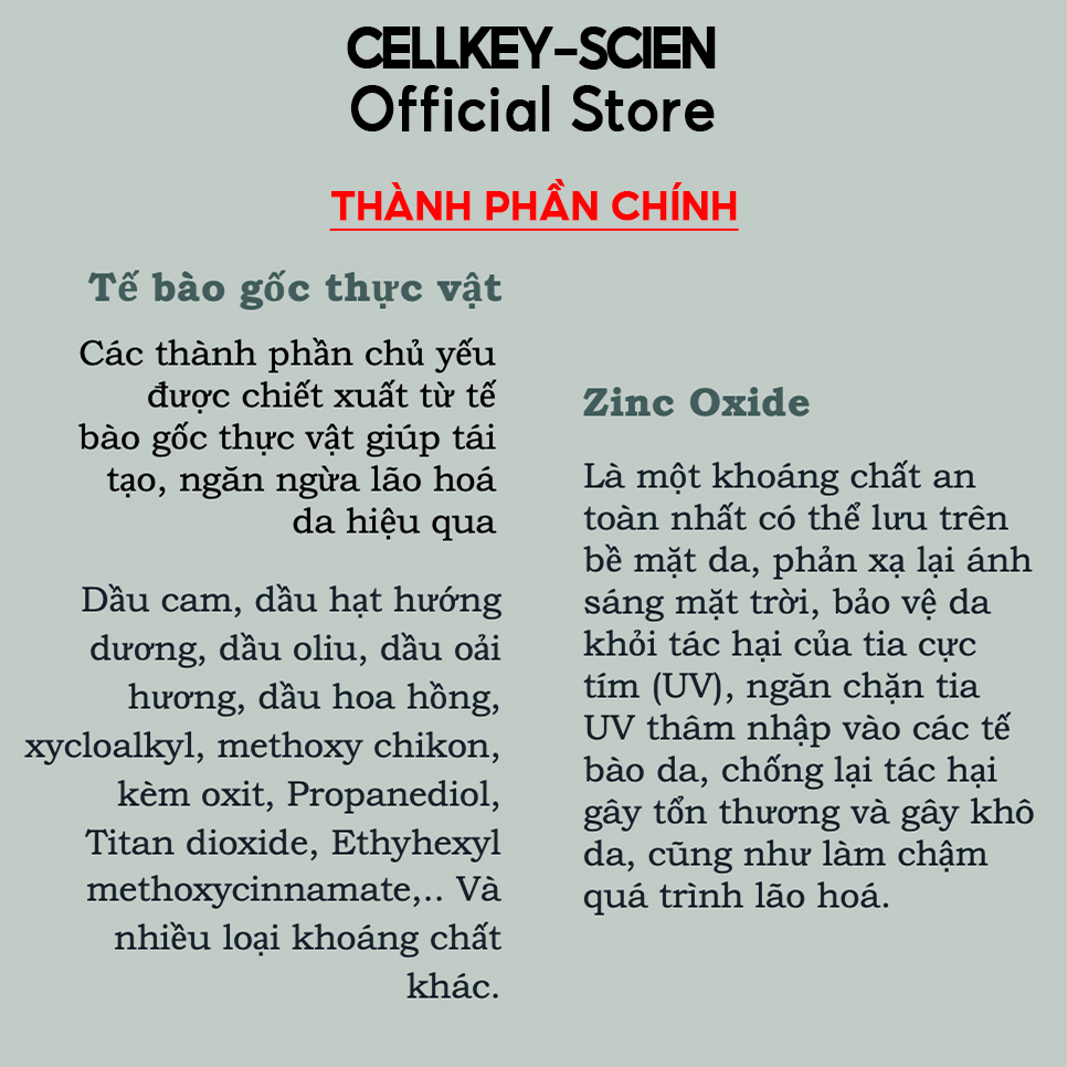 THÀNH PHẦN KEM CHỐNG NẮNG KIỀM DẦU DƯỠNG DA CELLKEY-SCIEN: