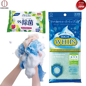 ✨Combo khăn tắm tạo bọt Whip's (loại vừa bọt) + khăn ướt khử trùng 20 tờ (không cồn) - nội địa Nhật Bản