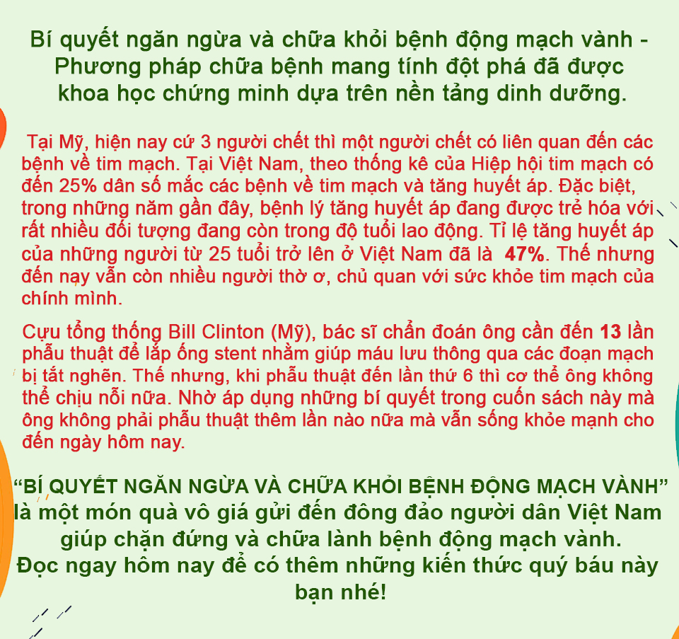 Bí quyết ngăn ngừa và chữa khỏi bệnh động mạch vành - Phương pháp chữa bệnh mang tính đột phá đã được khoa học chứng minh dựa trên nền tảng dinh dưỡng.