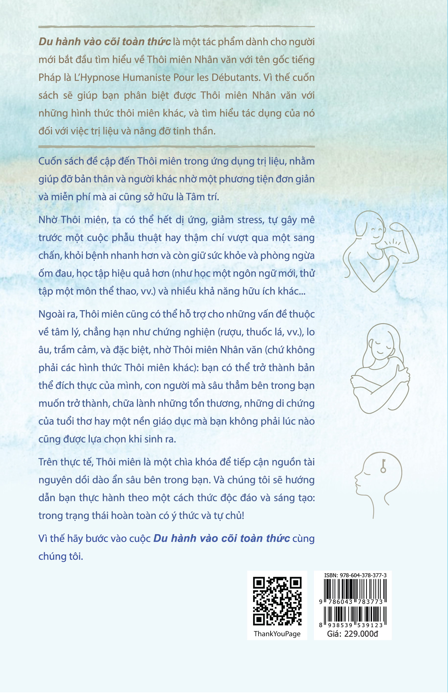 Mua tại Tiktok- Vài nét về cuốn Du Hành Vào Cõi Toàn Thức Du hành vào cõi toàn thức là một tác phẩm dành cho người mới bắt đầu tìm hiểu về Thôi miên Nhân văn với tên gốc Pháp là L’Hypnose Humaniste Pour les Débutants. Vì thế cuốn sách sẽ giúp bạn phân biệt được Thôi miên Nhân văn với những hình thức thôi miên khác, và tìm hiểu tác dụng của nó đối với việc trị liệu và nâng đỡ tinh thần. Cuốn sách đề cập đến Thôi miên trong ứng dụng trị liệu, nhằm giúp đỡ bản thân và người khác nhờ một phương diện đơn giản và miễn phí mà ai cũng sở hữu là Tâm trí. Nhờ Thôi miên, ta có thể hết dị ứng, giảm stress, tự gây mê trước một cuộc phẫu thuật hay thậm chí vượt qua một sang chấn, khỏi bệnh nhanh hơn và còn giữ sức khoẻ và phòng ngừa ốm đau, học tập hiệu quả hơn (như học một ngôn ngữ mới, thử tập một môn thể thao…) và nhiều khả năng hữu ích khác… Ngoài ra, Thôi miên cũng có thể hỗ trợ cho những vấn đề thuộc về tâm lý, chẳng hạn như chứng nghiện, lo âu, trầm cảm, và đặc biệt, nhờ Thôi miên Nhân văn (chứ không phải các hình thức Thôi miên khác): bạn có thể trở thành bản thể đích thực của mình, con người mà sâu thẳm bên trong bạn muốn trở thành, chữa lành những tổn thương, những di chứng của tuổi thơ hay một nền giáo dục mà bạn không phải lúc nào cũng được lựa chọn khi sinh ra. Trên thực tế, Thôi miên là một chìa khoá để tiếp cận nguồn tài nguyên dồi dào ẩn sâu bên trọng bạn. Và chúng tôi sẽ hướng dẫn bạn thực hành theo một cách thức độc đáo và sáng tạo: trong trạng thái hoàn toàn có ý thức và tự chủ! Vì thế hãy bước vào cuộc Du hành vào cõi toàn thức cùng chúng tôi.