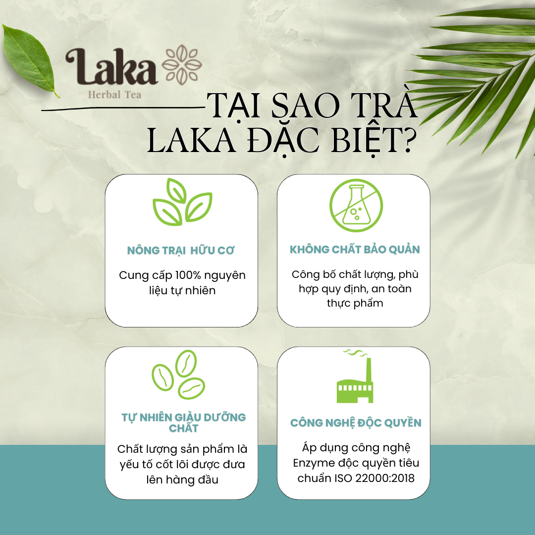 Câu chuyện Laka Trà Cascara là thứ thức uống kỳ lạ và thú vị giao thoa giữa cà phê và trà, ít ai có thể ngờ rằng từ lớp vỏ thịt cà phê trở thành thức uống mang lại giá trị dinh dưỡng cao. Tại LaKa chúng tôi tạo ra các loại trà từ quả cà phê có hương vị tuyệt vời được phối trộn hoàn hảo với những loại thảo dược tự nhiên chất lượng hàng đầu được chọn lọc khắt khe theo tiêu chuẩn ISO 22000:2018. Bạn có thể cảm nhận được vị thanh ngọt của trà, vị chua nhẹ dịu mát của trái cây chín mọng cùng hương thảo mộc thoang thoảng thật dễ chịu. LaKa giải quyết câu chuyện môi trường Hướng tới môi trường bền vững. Giờ đây những vỏ thịt quả cà phê chín mọng đang được Laka sử dụng để sản xuất ra loại Trà Cascara độc đáo của riêng mình. Dây chuyền sản xuất công nghệ hiện đại kết hợp công thức bí truyền ủ và lên men mang đến bạn một tách trà cà phê trọn vị, an nhiên cho sức khỏe. Sử dụng Trà Cascara của Laka là bạn đang thưởng thức cả những tâm tình được mang vào trong từng tách trà của chúng tôi !