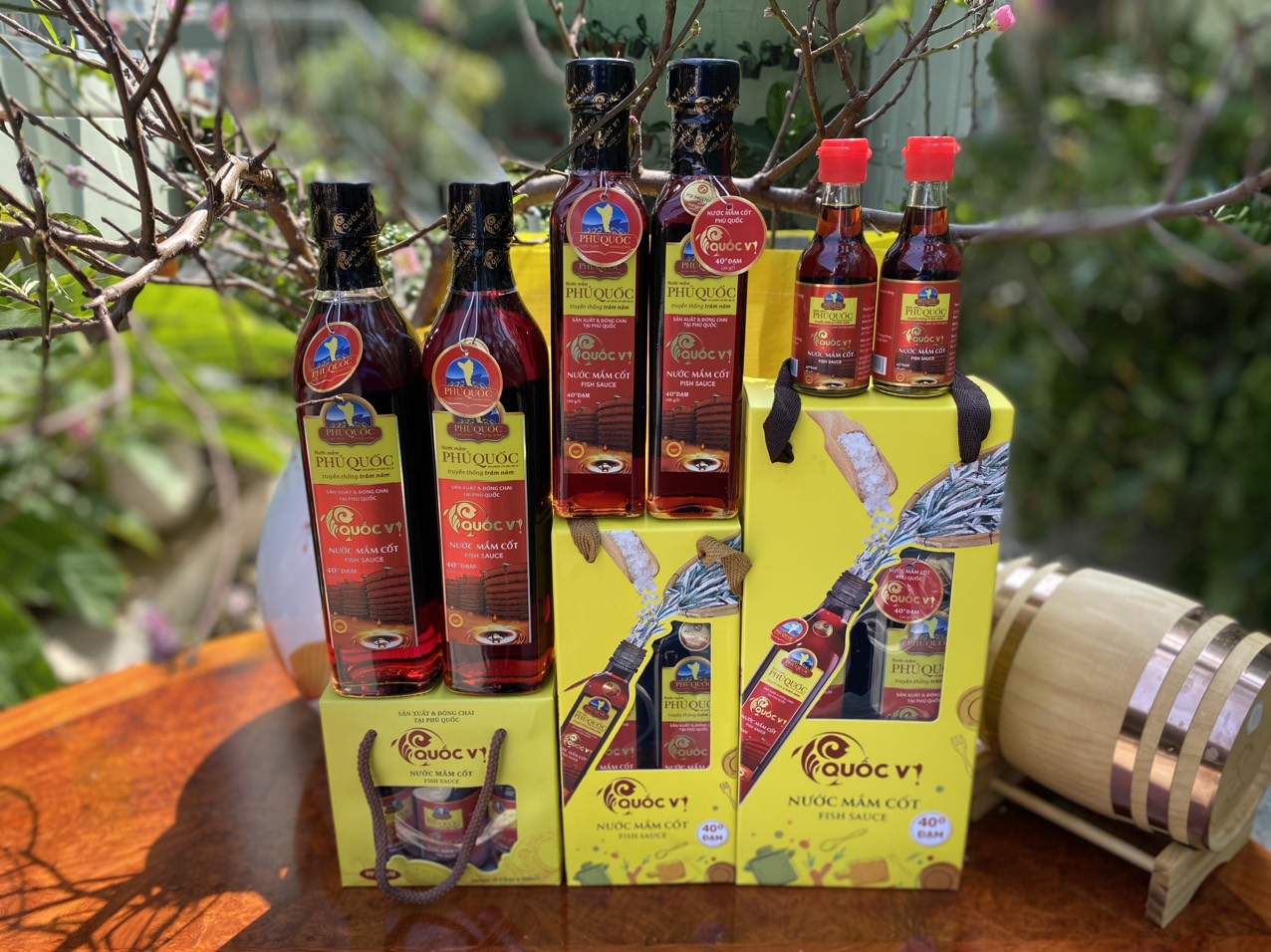 Combo Tết 3 Hộp Vàng Nước Mắm Cốt Phú Quốc - Quốc Vị Độ Đạm 40N Chai Thủy Tinh 520ml, 250ml, 60ml Cá Cơm