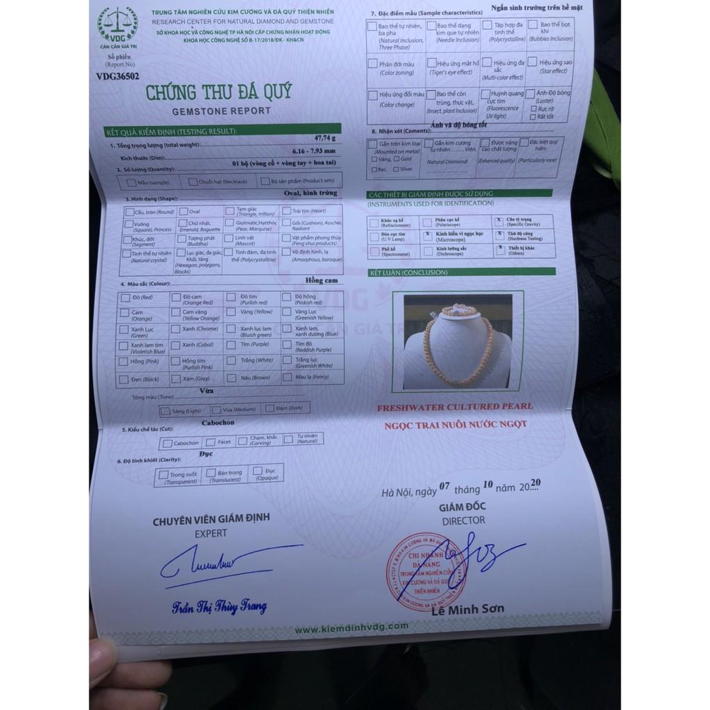 Chất liệu full bộ: Ngọc Trai nuôi cấy tự nhiên + đá cẩm thạch Kích thước hạt đường kính 7-8 li (Ngọc Tự Nhiên nên mỗi viên mang một vẻ, không được đồng nhất tuyệt