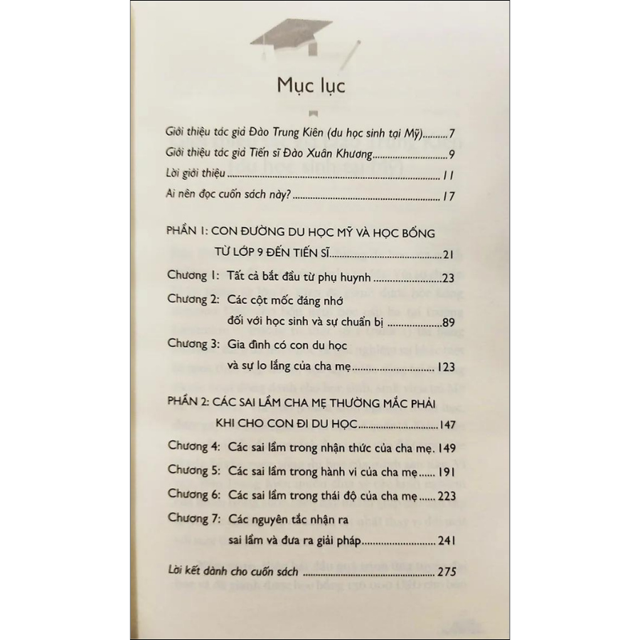 • Du học là hành trình chông gai có sự tham gia của cả cha mẹ và con cái, từ khâu chuẩn bị đến khi con nhập trường và học tập suốt nhiều năm. Tiến sĩ Đào Xuân Khương thấu hiểu những nỗi lo lắng và những điều thắc mắc của các bậc cha mẹ có dự định cho con đi du học. Ông đưa ra những mô hình phù hợp với phụ huynh có mong muốn thấu hiểu con mình hơn, từ đó có định hướng, chiến lược chọn ngành, chọn nghề, chọn trường học cho con. Ông cũng chỉ ra những sai lầm cha mẹ cần tránh khi có con du học ở Mỹ.
