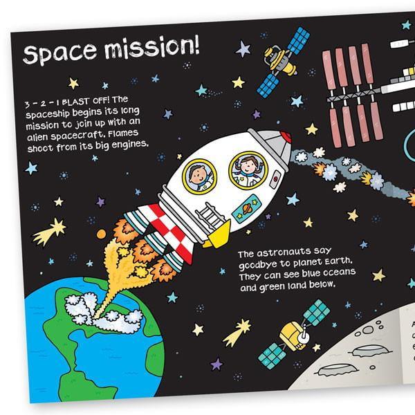 Convertible Spaceship can be used as a story book, large play mat and be transformed into a sit-in spaceship toy. Read the short story with your child about a space mission to reach an alien spacecraft. The illustrated story route allows your child to follow and interact with the story on the large play mat using their own toys. The sit-in toy allows your child to pretend to leave Earth and blast off in a space rocket.