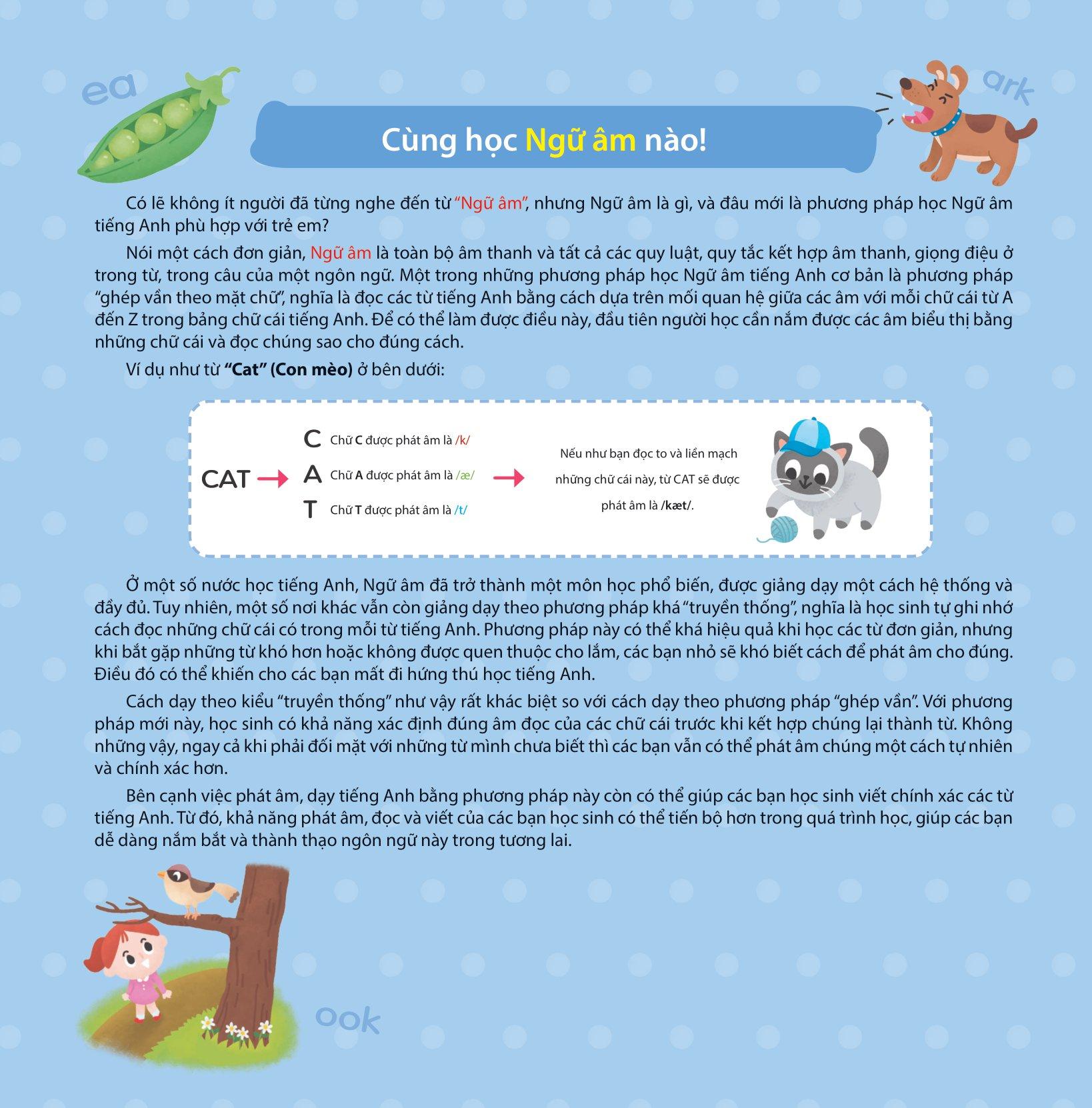 Với những ví dụ sinh động, dễ tiếp thu, kèm theo các bài thực hành nâng cao đầy tính thực tiễn và các audio dạy phát âm chuẩn bằng giọng Anh-Mỹ bản xứ, bộ sách sẽ cung cấp cho các em những kiến thức cần thiết để học ngữ âm tiếng Anh. Đúng như tên gọi, bộ sách được chia thành ba cấp độ từ cơ bản đến phức tạp, hướng dẫn các em rèn luyện từng bước một để nắm chắc các âm trong tiếng Anh. Ngoài ra, bộ sách còn lồng ghép những bài hát vui nhộn và những câu chuyện ngắn được minh họa đẹp mắt, hứa hẹn sẽ giúp cho việc học tập của các em thêm phần thú vị và hiệu quả.