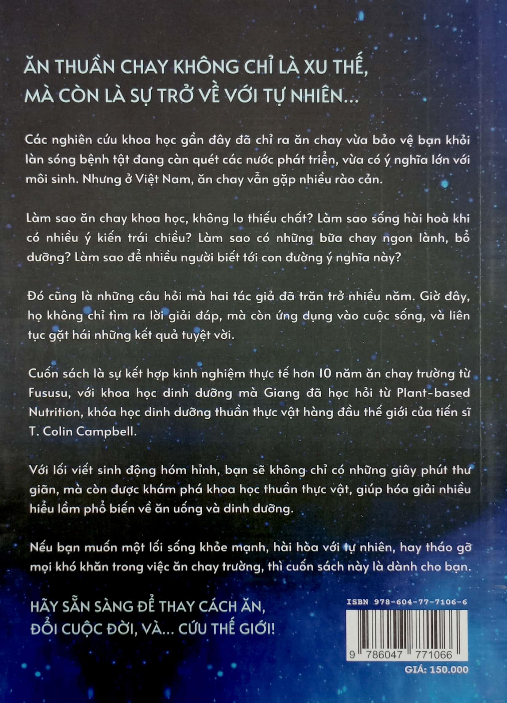 Cuốn sách là sự kết hợp kinh nghiệm thực tế hơn 10 năm ăn chay trường từ Fususu, với khoa học dinh dưỡng mà Giang đã học hỏi từ Plant-based Nufrition, khóa học dinh dưỡng thuần thực vật hàng đầu thế giới của tiến sĩ T. Colin Campbell.