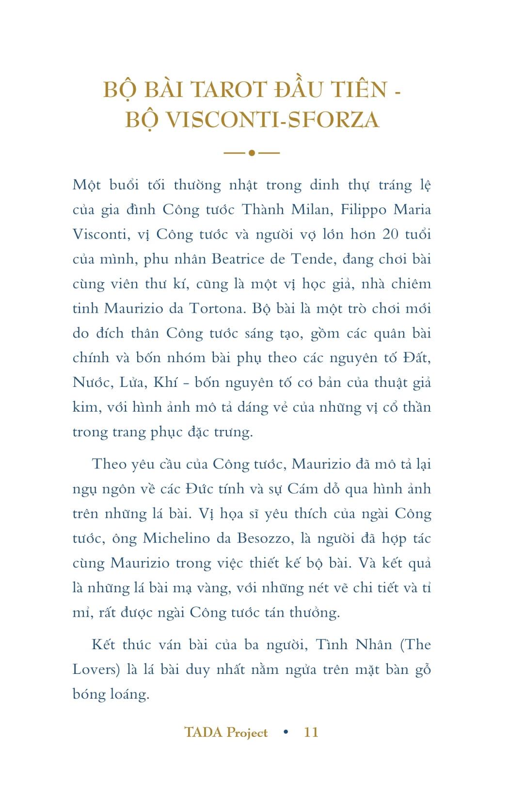 Cuộc phiêu lưu của những lá bài Tarot là một cuộc hành trình xuyên qua thời gian và không gian, đưa bạn đi qua các giai đoạn lịch sử, khám phá nguồn gốc của Tarot, khám phá ý nghĩa biểu tượng và hình ảnh trên từng lá bài, cách mà chúng liên kết với nhau để tạo nên một hệ thống biểu tượng phức tạp và sâu sắc. Không chỉ đơn thuần “học về Tarot”, cuốn sáchcòngiúp bạn khám phá sự kết nối của Tarot với các lĩnh vực khác như tâm lý học, chiêm tinh học, thuật giả kim,… Bạn sẽ thấy sự hiện diện của Tarot ở khắp mọi nơi, trong mọi khía cạnh của trí tuệ nhân loại.