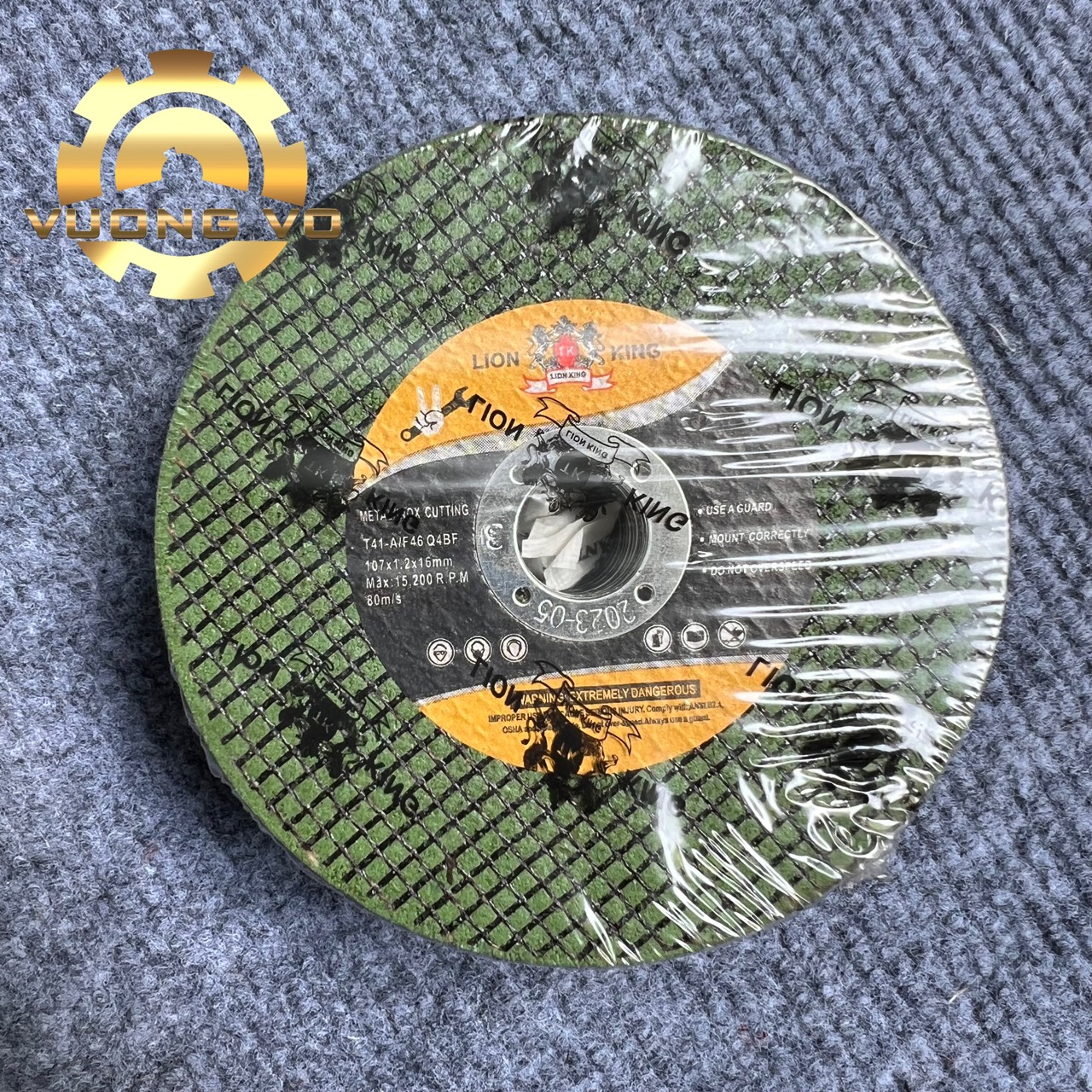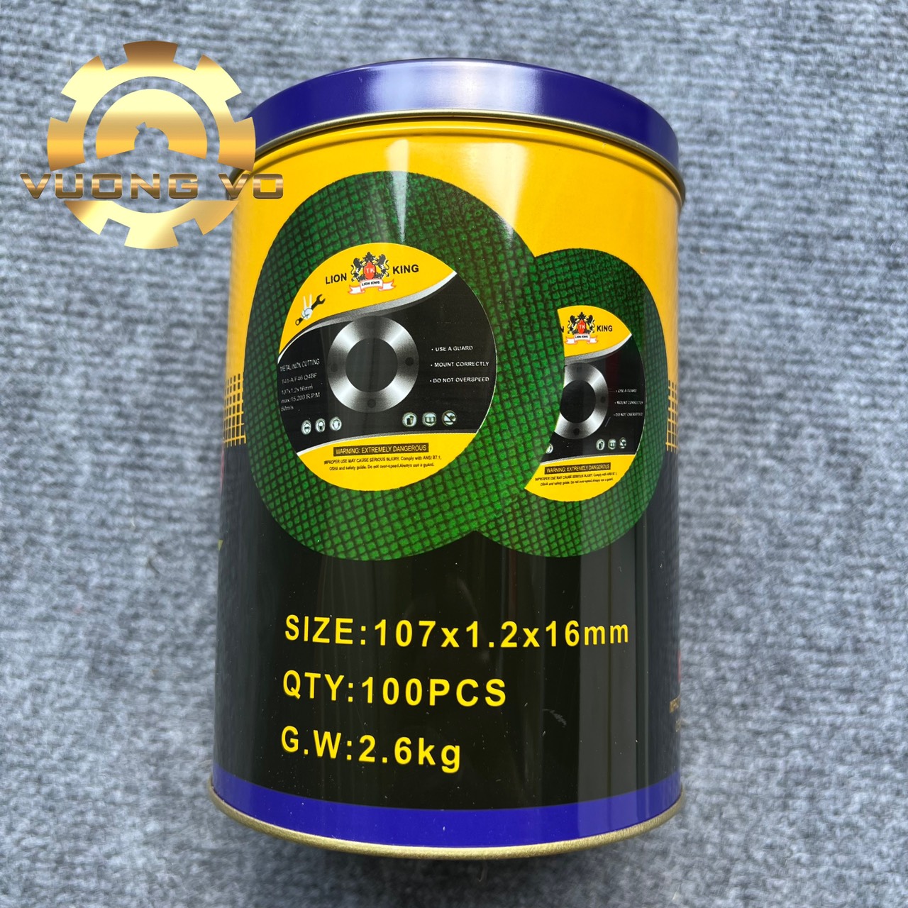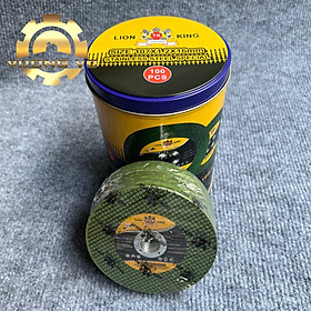 Tên sản phẩm: Đá cắt 100mm Thương hiệu: Lionking Kích thước: -Đường kính:107mm -Độ dày: 1.2mm -Đường kính cốt: 16mm Quy cách đống gói: -Lốc 25 viên -Hộp 100 viên Đá cắt Lionking được đánh