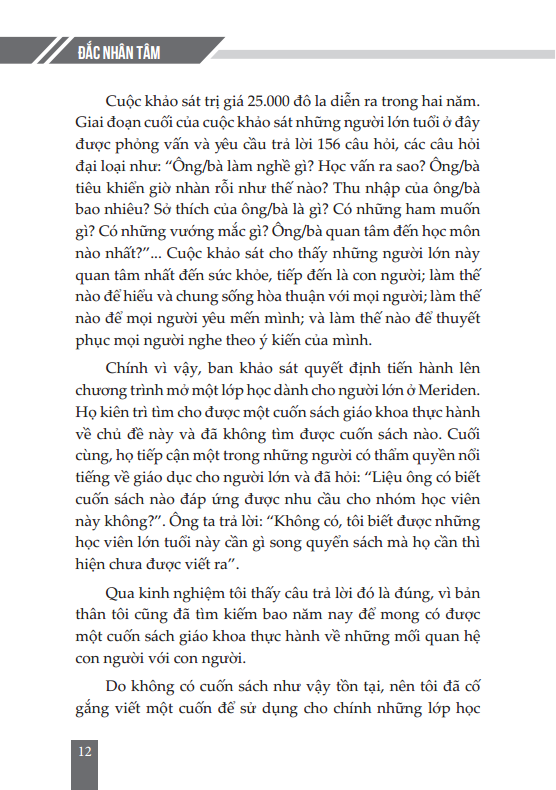 Đắc Nhân Tâm là cuốn sách đưa ra các lời khuyên về cách thức cư xử, ứng xử và giao tiếp với mọi người để đạt được thành công trong cuộc sống. Gần 80 năm kể từ khi ra đời, Đắc Nhân Tâm là cuốn sách gối đầu giường của nhiều thế hệ luôn muốn hoàn thiện chính m.ình để vươn tới một cuộc sống tốt đẹp và thành công.