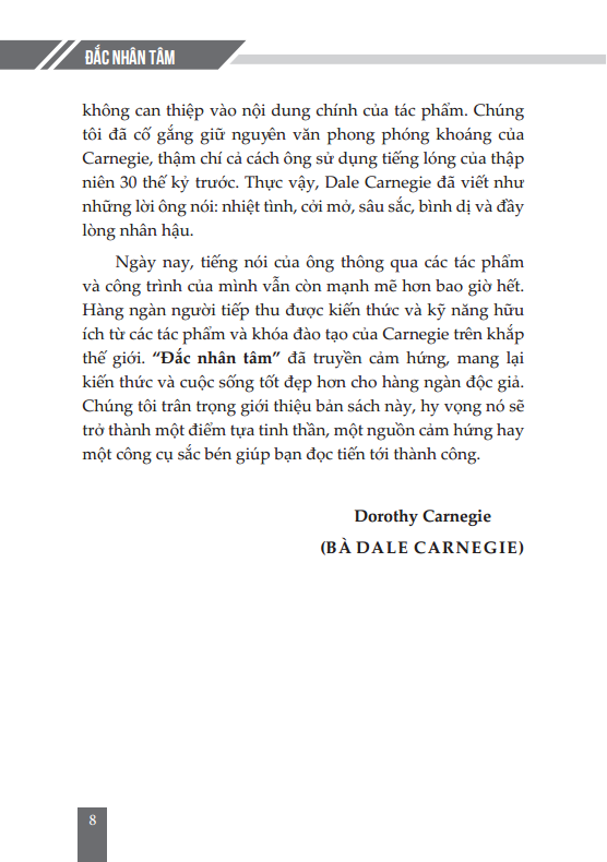 Đắc Nhân Tâm, từ một cuốn sách, hôm nay đã trở thành một danh từ để chỉ một lối sống mà ở đó con người ta cư xử linh hoạt và thấu tình đạt lý. Lý thuyết muôn thuở vẫn là những quy tắc chết, nhưng Nhân Tâm là sống, là biến đổi. Bạn hãy thử đọc "Đắc Nhân tâm" và tự m.ình chiêm nghiệm những cái đang diễn ra trong đời thực hiện hữu, chắc chắn bạn sẽ có những bài học cho riêng m.ình.