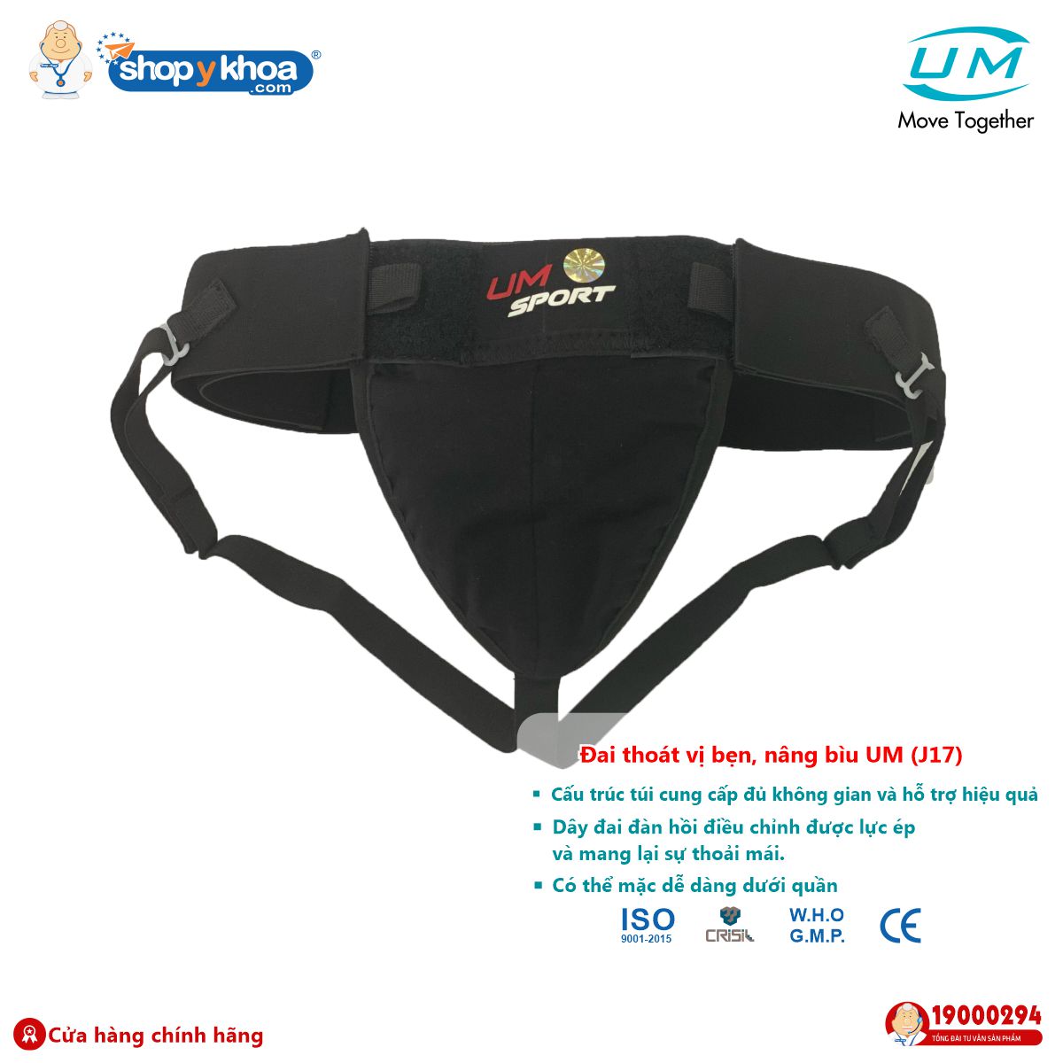 CHỈ ĐỊNH Đai thoát vị bẹn, nâng bìu UM (J17) có kiểu dáng rộng rãi, thoải mái, cung cấp đủ không gian, hỗ trợ hiệu quả cho thoát vị bẹn kèm túi nâng bìu riêng biệt. ĐẶC TÍNH VÀ HỖ TRỢ