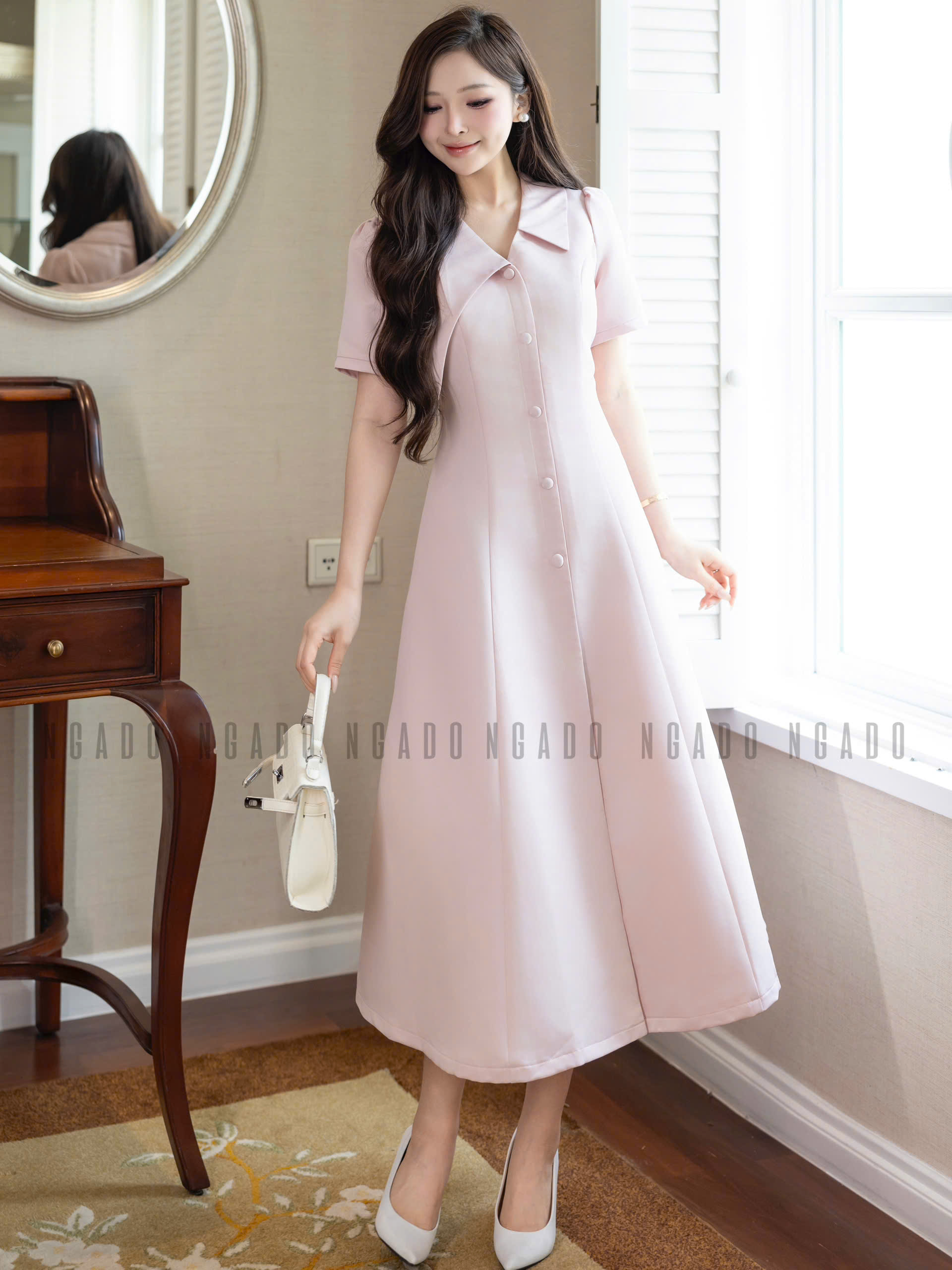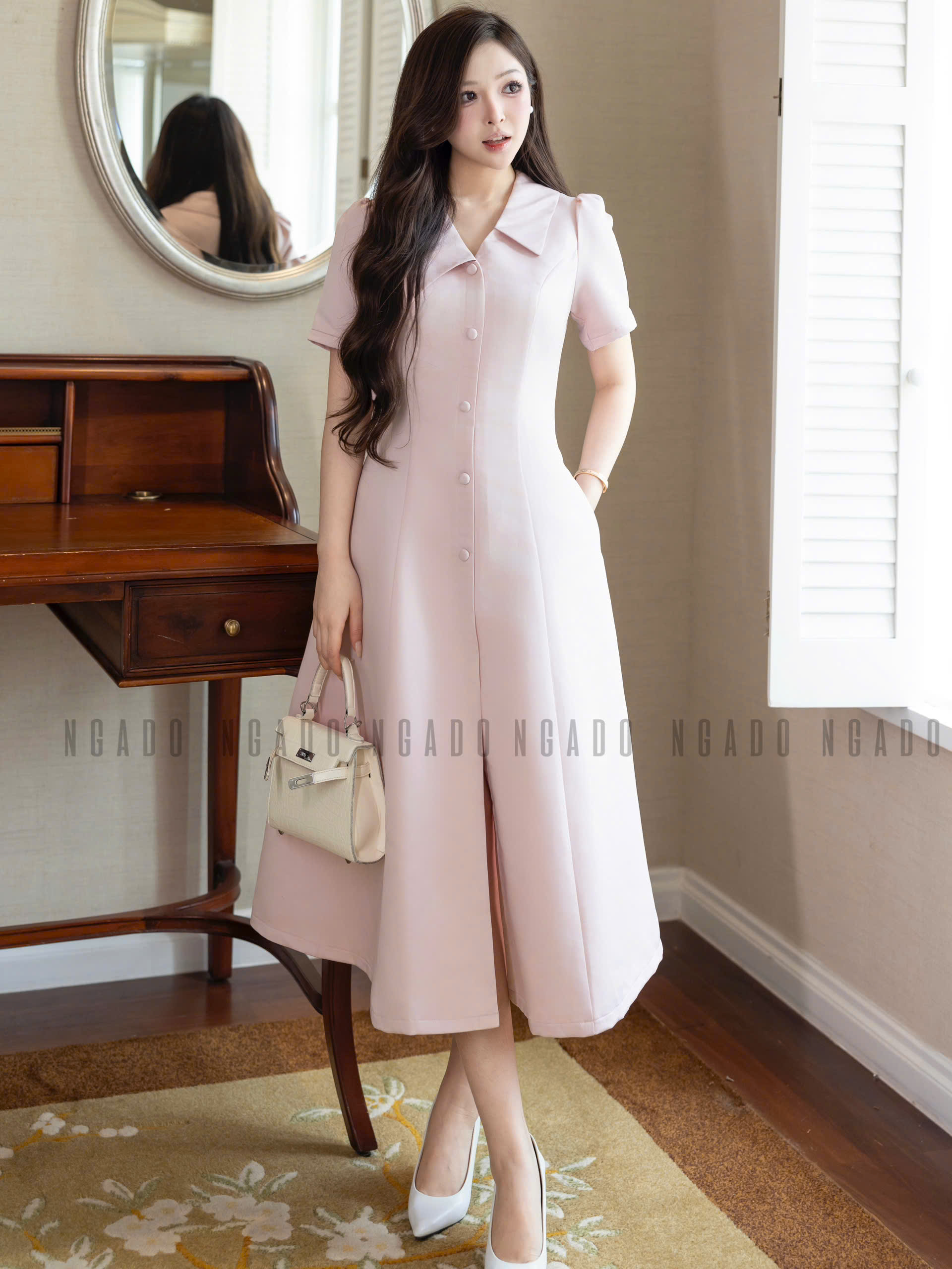 ✨Đầm hồng cổ vest NGADO , đầm công sở , dự tiệc