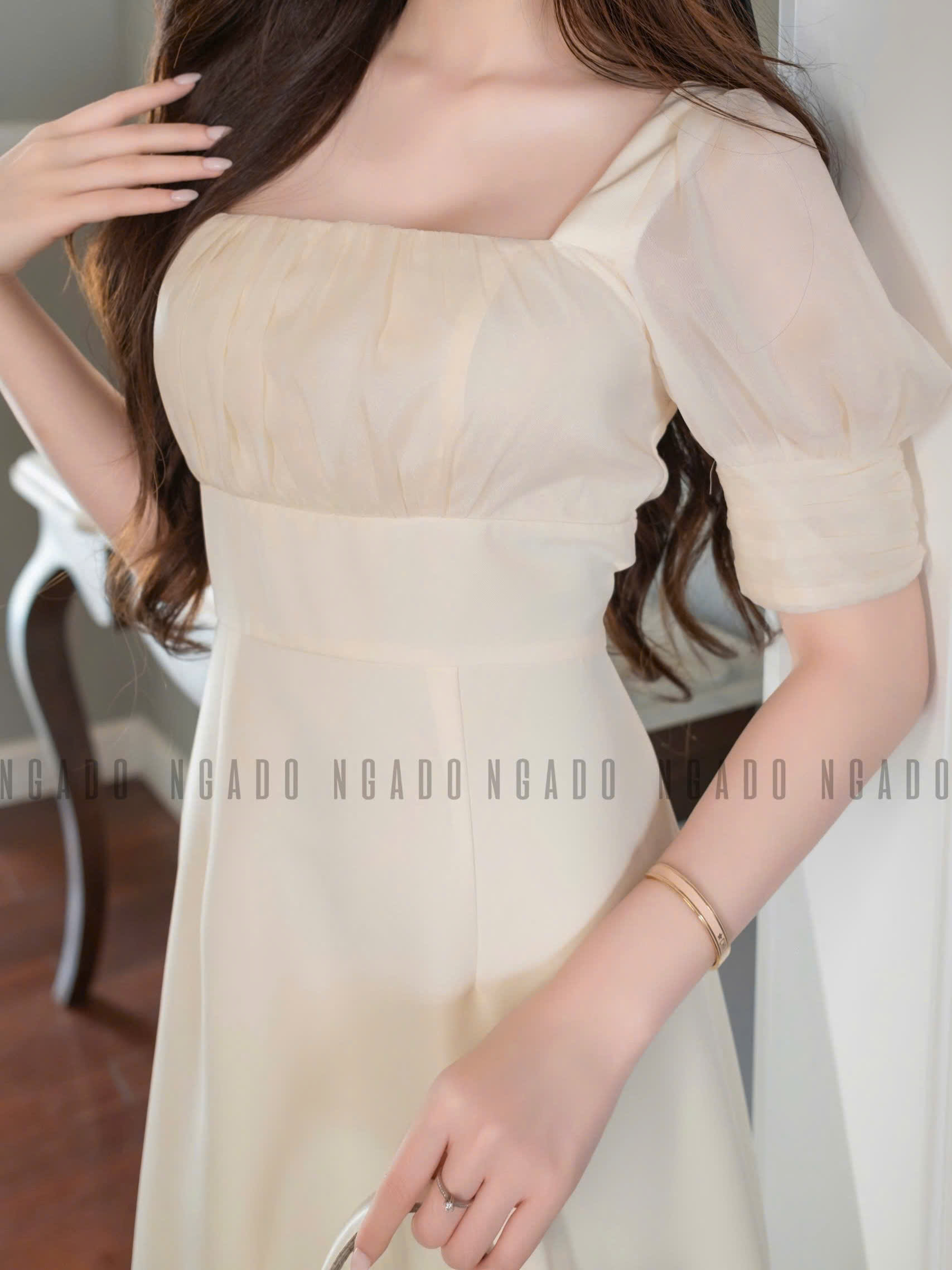 ✨Đầm kem cổ vuông phối voan NGADO , đầm kiểu Nữ , đầm voan