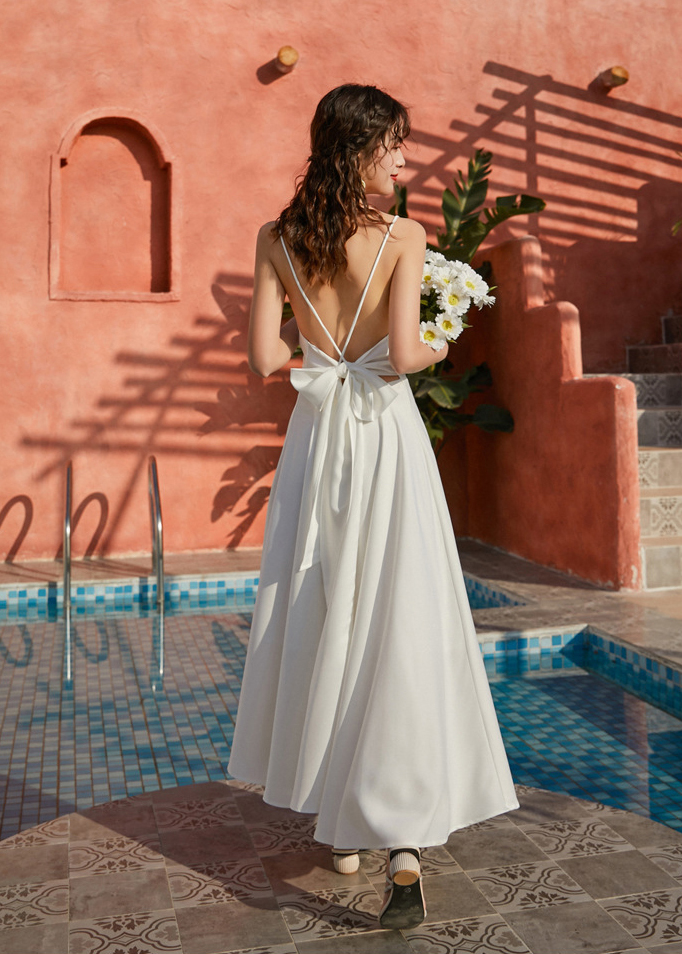 Mua tại Tiktok- Dạo bước trên bãi biển với chiếc váy lụa trơn, suông, trần lưng với điểm nhấn là chiếc nơ cực kì điệu đà.