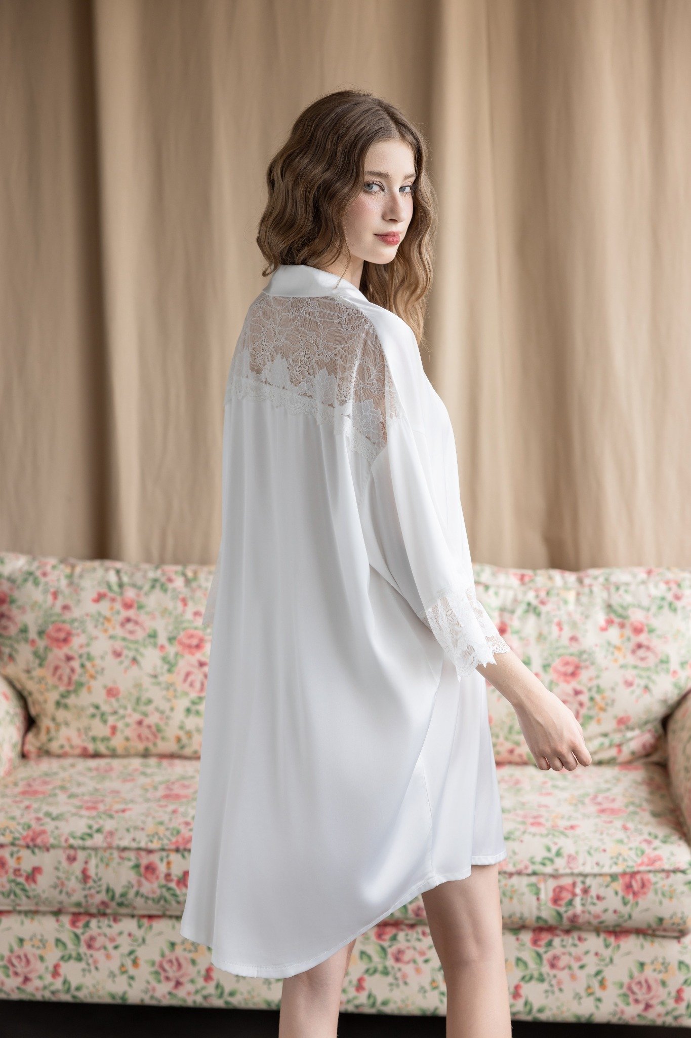 Mua tại TiktokThương hiệu: Sanny House Tên sản phẩm: Đầm ngủ sơmi D561 Chất liệu: lụa cao cấp mềm mịn, co giãn, thấm hút tốt Kiểu dáng: sang chảnh, trẻ trung, hiện đại Màu: trắng Size: dưới 70kg