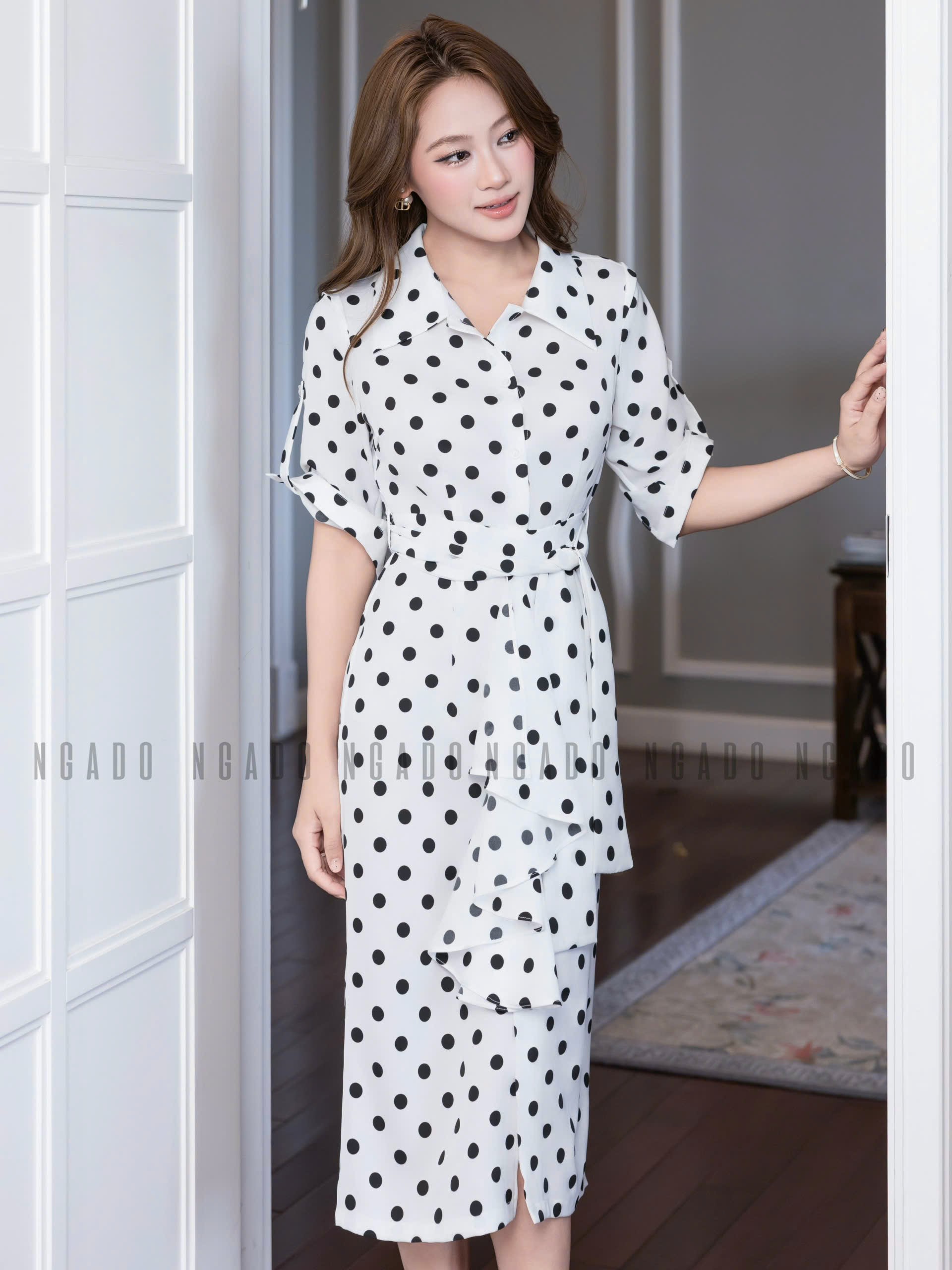 ✨Đầm sơ mi chấm bi tay lửng NGADO , đầm sơ mi , đầm chấm bi , đầm kiểu