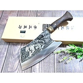 - Chức năng: Chặt xương ống, chân giò, trâu bò - Kích thước: Lưỡi: 22cm, cán: 10cm, rộng: 10cm, dầy: 5ly, trọng lượng: 800g - Cán : Gỗ mun, Khâu đồng đỏ , chốt đinh