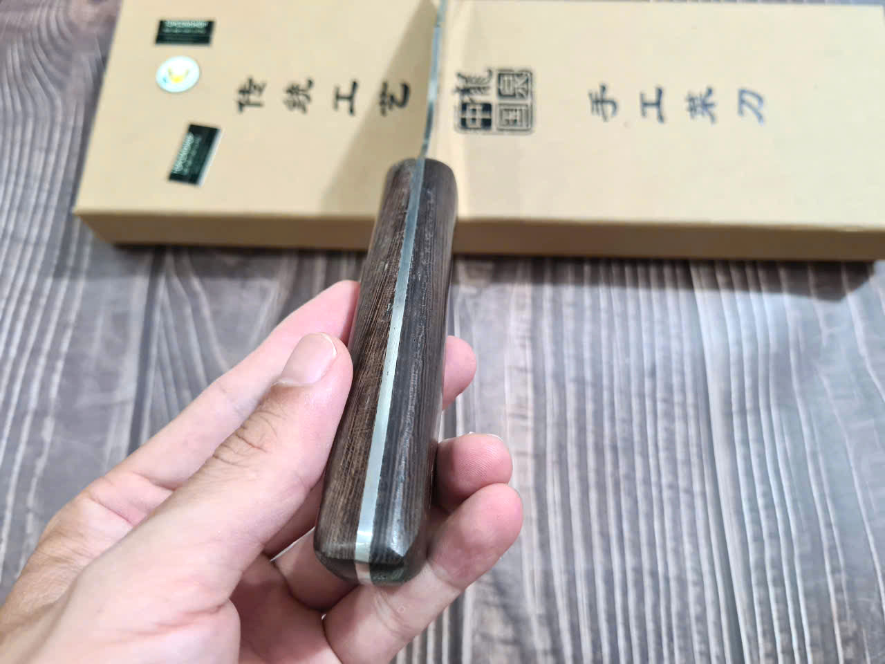 - Chức năng: thái thịt, rau củ quả - Kích thước: Lưỡi: 17cm, cán: 12cm, rộng: 5cm, dầy: 1ly, trọng lượng: 200g - Cán : Gỗ cẩm chỉ, Chốt, Khâu ĐỒNG ĐỎ , keo liên