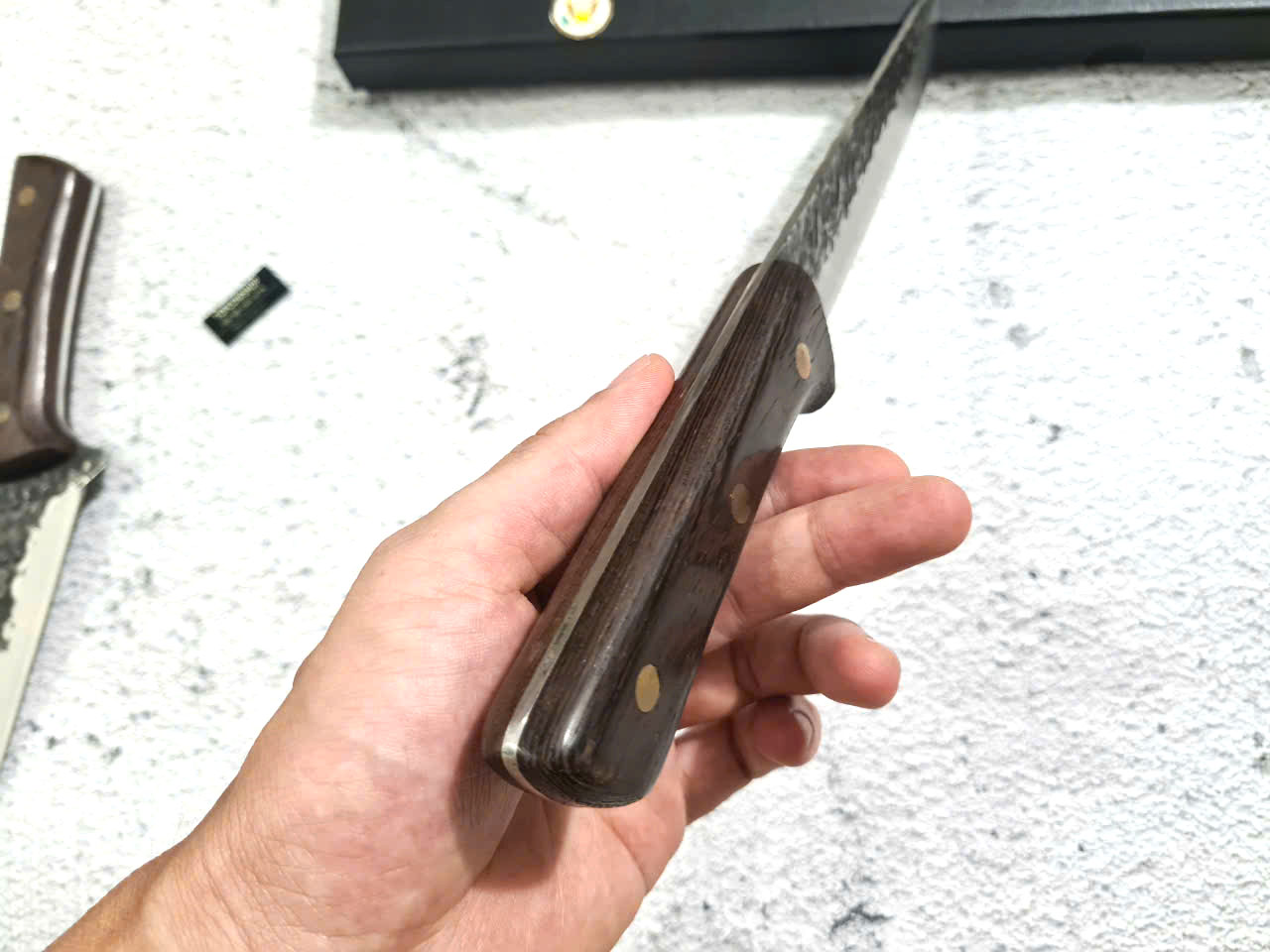 • Chất liệu: Thép Nhật 420J2, độ cứng 53HRC – siêu bền, chống gỉ • Lưỡi dao: Dày 2.5mm, sắc bén, hoàn thiện bằng đá mài nước • Tay cầm: Gỗ Pakka sang trọng, chống