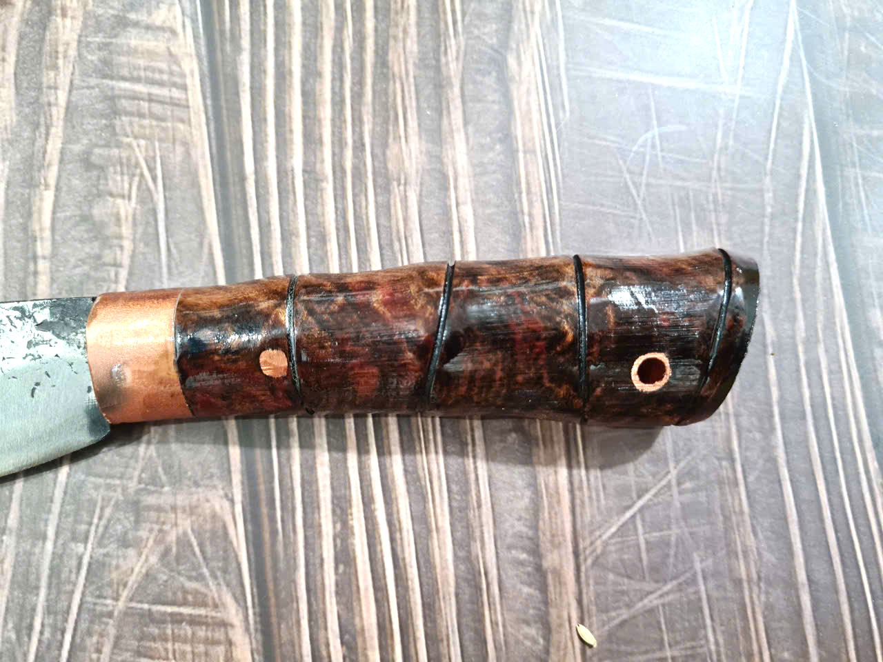 Cán gỗ cẩm chỉ núi đá kết hợp với khâu đồng đỏ được chốt đinh tán và keo liên kết đảm bảo độ bền chắc.