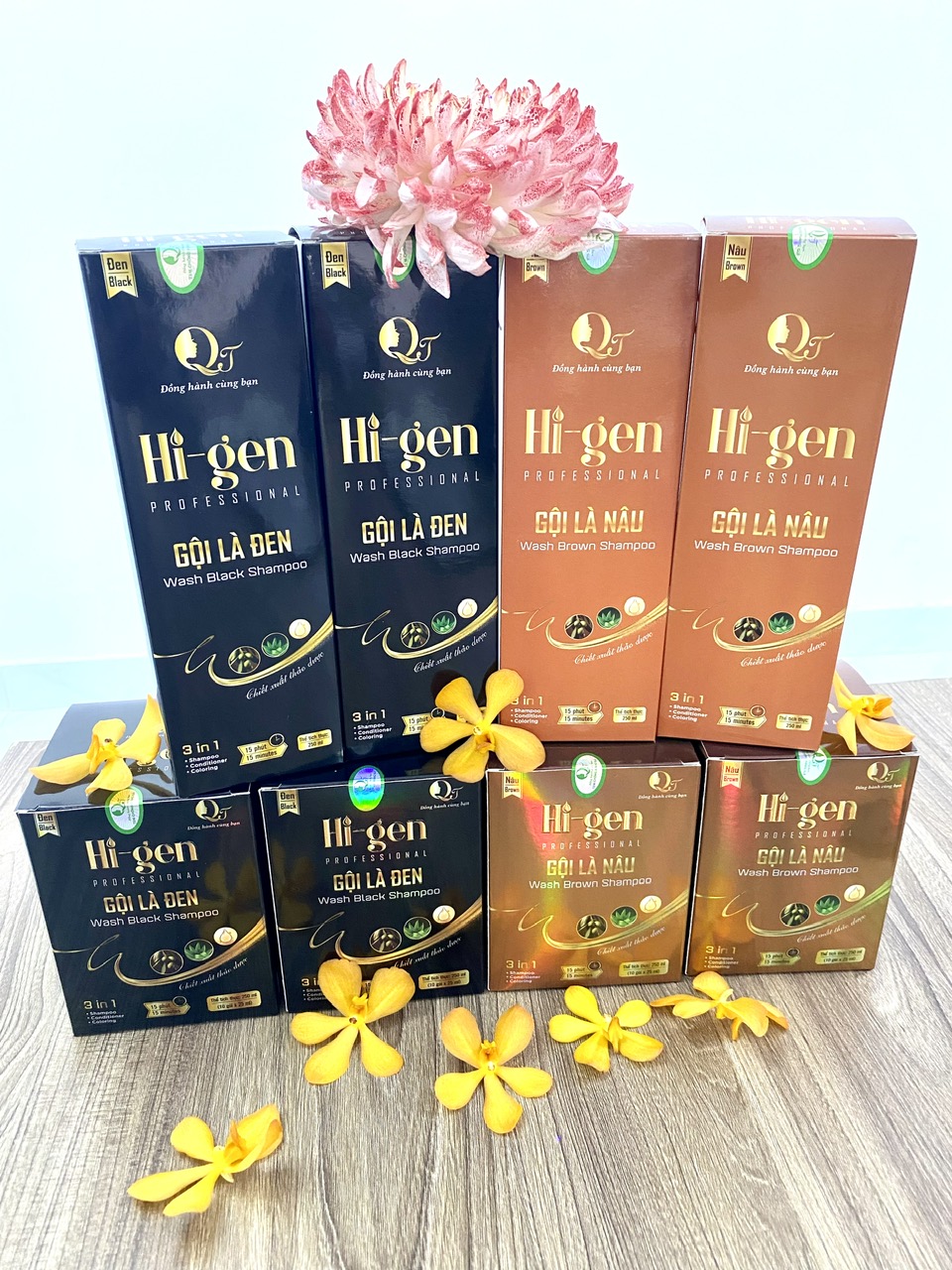 Dầu gội Phủ Bạc Hi-gen _ Gội là Đen gói 25ml (Hộp 10 gói) Với nguyên liệu nhập khẩu trực tiếp từ nước ngoài mang mùi hương thoang thoảng từ hà thủ ô, linh chi, nhân sâm cùng nhiều loại thảo dược khác… sản phẩm hấp thu hắc sắc tố nhanh chóng và an toàn cho người sử dụng. Cách dùng: Bước 1:Làm ướt tóc, lau sơ lại (không lau quá khô, không thêm nước khi gội) Bước 2: Đeo găng tay vào ( dầu gội không gây hại nhưng tránh làm đen móng tay) Bước 3: Cắt gói dầu gội và cho toàn bộ hỗn hợp ra tay rồi trộn đều (Bao bì dầu gội có 2 ngăn). Sau đó, thoa đều hỗn hợp lên tóc và mát xa 15 - 25 phút. Trường hợp tóc đang sửa dụng thuốc nhuộm thì có thể để lâu hơn. Bước 4: Dùng khăn ướt lau sạch vùng da hoặc vành tai ( nếu bị dính dầu gội). Bước 5: Xả lại với nước sạch, không dùng dầu gội, dầu xả trong vòng 24h. Công dụng: Phủ bạc mái tóc nhanh chóng, màu tóc đen huyền tự nhiên. Thơm nhẹ mùi nhân sâm không gây hắc khó chịu Bền màu, trung bình 1-2 tháng mới cần gội lại. Không gây kích ứng cho da đầu Chỉ 25 phút với các bước vô cùng đơn giản có ngay mái tóc đen óng mượt Hạn sử dụng: 3 năm kể từ ngày sản xuất Lưu ý: