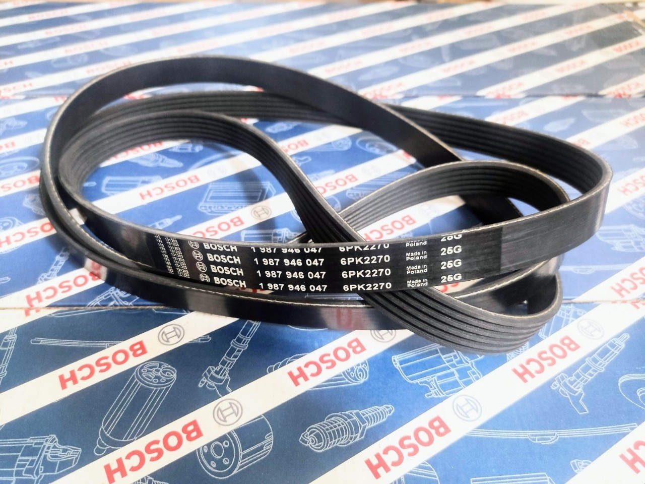 Dây curoa Bosch thay thế hoàn hảo cho phụ tùng nguyên bản theo xe Đặc trưng của dây curoa Bosch: - Mặt trước được cấu tạo bởi các sợi chịu lực bằng Polyester cấu trúc