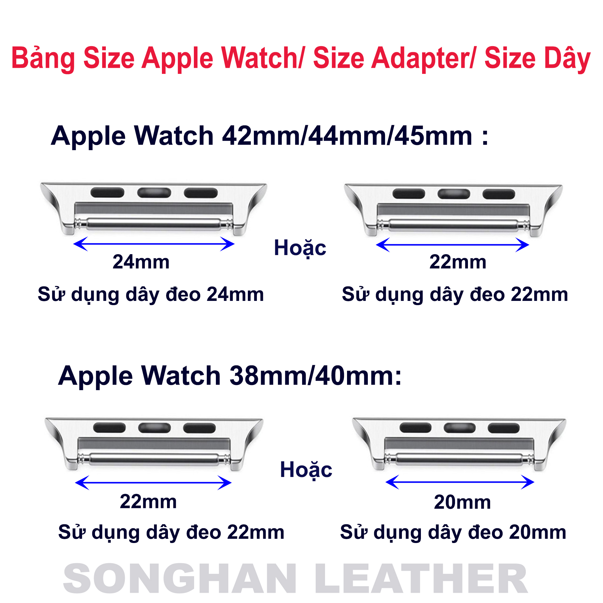 Dây da Apple Watch ĐÀ ĐIỂU handmade cao cấp nhiều màu chỉ trắng size 20mm, 22mm  - DÂY ĐƯỢC LÀM HOÀN TOÀN THỦ CÔNG TỈ MỈ - ĐÀ ĐIỂU THẬT 100%, NÓI KHÔNG VỚI GIẢ DA VÀ DA DẬP VÂN -DA LÓT CAO CẤP CHỐNG THẤM NƯỚC VÀ MỒ HÔI - KHÓA VÀ ADAPTER CAO CẤP KHÔNG RỈ, KHÔNG BAY MÀU GỒM 3 MÀU KHÓA :VÀNG, BẠC, ĐEN CHI TIẾT SẢN PHẨM: - Chiều dài:120mm x 75mm  - Màu sắc: Xanh Navy, Xanh Rêu, Vàng  - Size dây: 38-40-41mm size 20mm. 42-44-45mm size 22mm Phù hợp với các dòng Apple Watch Series 1, Apple Watch Series 2, Apple Watch Series 3, Apple Watch Series 4, Apple Watch Series 5, Apple Watch Series 6, Apple Watch Series 7, Watch SE HƯỚNG DẪN CHỌN DÂY APPLE WATCH: Có 2 cỡ adapter: - iWatch 38mm, 40mm, 41mm dùng cùng 1 loại adapter; - iWatch 42mm 44mm, 45mm dùng cùng 1 loại adapter - Khách hàng xem cỡ được ghi ở mặt sau đồng hồ  *** Lưu ý: Apple đã nghiên cứu cỡ iWatch với cỡ dây cân đối. Với iWatch size 38mm, 40mm, 41mm có thể dùng dây da size 20mm. Còn iWatch size 42mm, 44mm,45mm dùng dây da size ==============  BẢO HÀNH - Bảo hành 6 tháng về da do lỗi sản xuất: da bị bong tróc, nổ tự nhiên, tuột đường chỉ, hỏng khóa… - Thời hạn bảo hành được tính từ ngày mua hàng(được quản lý trên hệ thống của shop) KHÔNG ĐƯỢC BẢO HÀNH: Những thiệt hại trong quá trình sử dụng: sản phẩm bị rách, trầy xước do người sử dụng (va quệt, rạch, co kéo…), bị hao mòn hoặc cháy trong quá trình sử dụng, hoặc do môi trường gây ra…  XỬ LÝ SỰ CỐ: Quá trình vận chuyển bi hư hỏng hoặc phát nhầm SP, quý khách hàng vui lòng chụp ảnh sản phẩm, chúng tôi sẽ xử lý, giải quyết vấn Chúng tôi biết bạn có nhiều lựa chọn. Xin cảm ơn bạn đã chọn lựa chúng tôi !