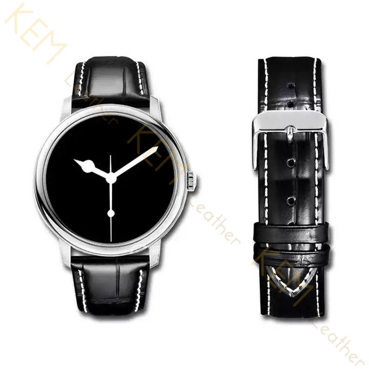 Dây da đồng hồ cá sấu đen chỉ trắng với 2 đường gai nổi bật