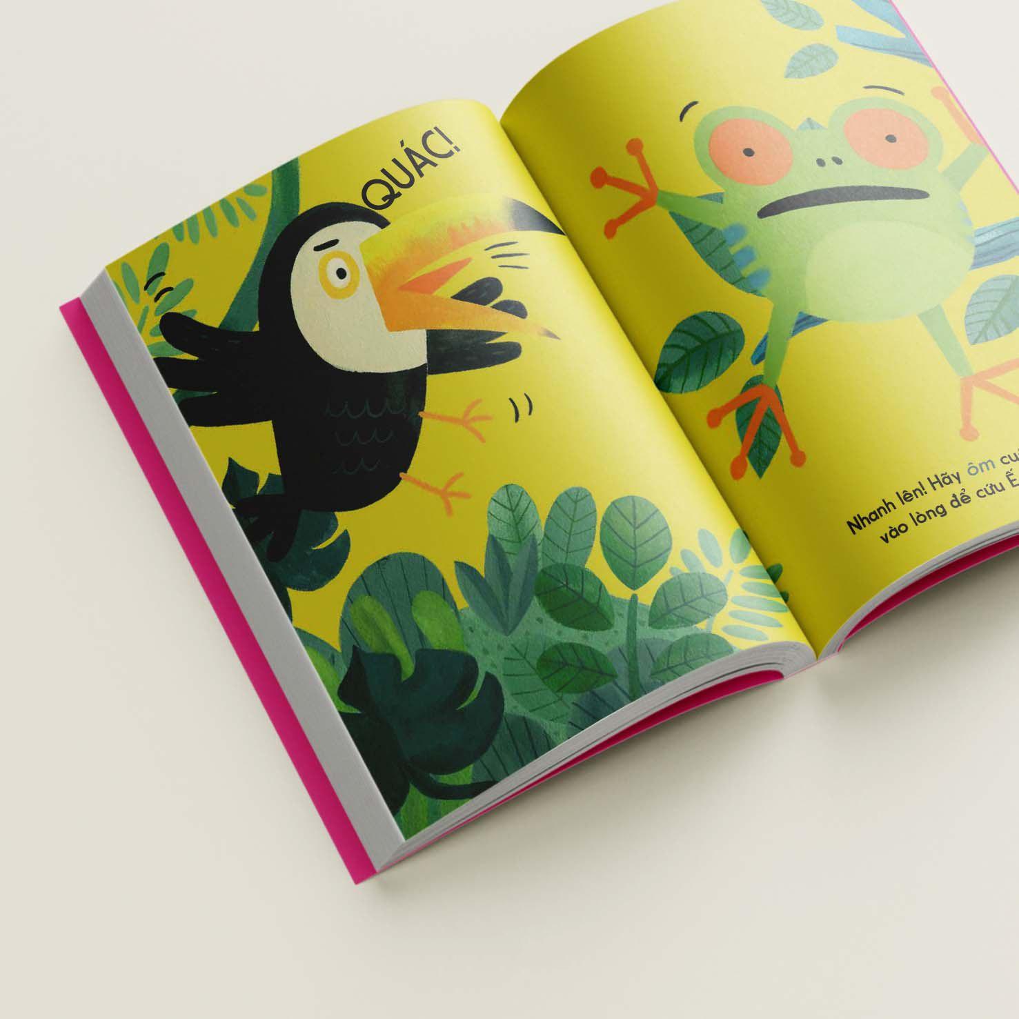 Trong cuốn sách này, em sẽ được gặp bạn Ếch Ộp. Đầu tiên em hãy lắc cuốn sách lên rồi xuống để Ếch Ộp nhảy nhót nhé. Úi cha, em lắc mạnh quá nên Ếch Ộp nhảy mất hút luôn rồi! Hãy để những ngón tay em chạy trên trang sách theo bóng Ếch Ộp nha. Ếch Ộp gặp ai thế kia? Một chú chim toucan không hề thiện chí chút nào. Em hãy lật giở các chiếc lá để giúp Ếch Ộp ẩn m.ình trốn khỏi chú chim gắt gỏng nhé.