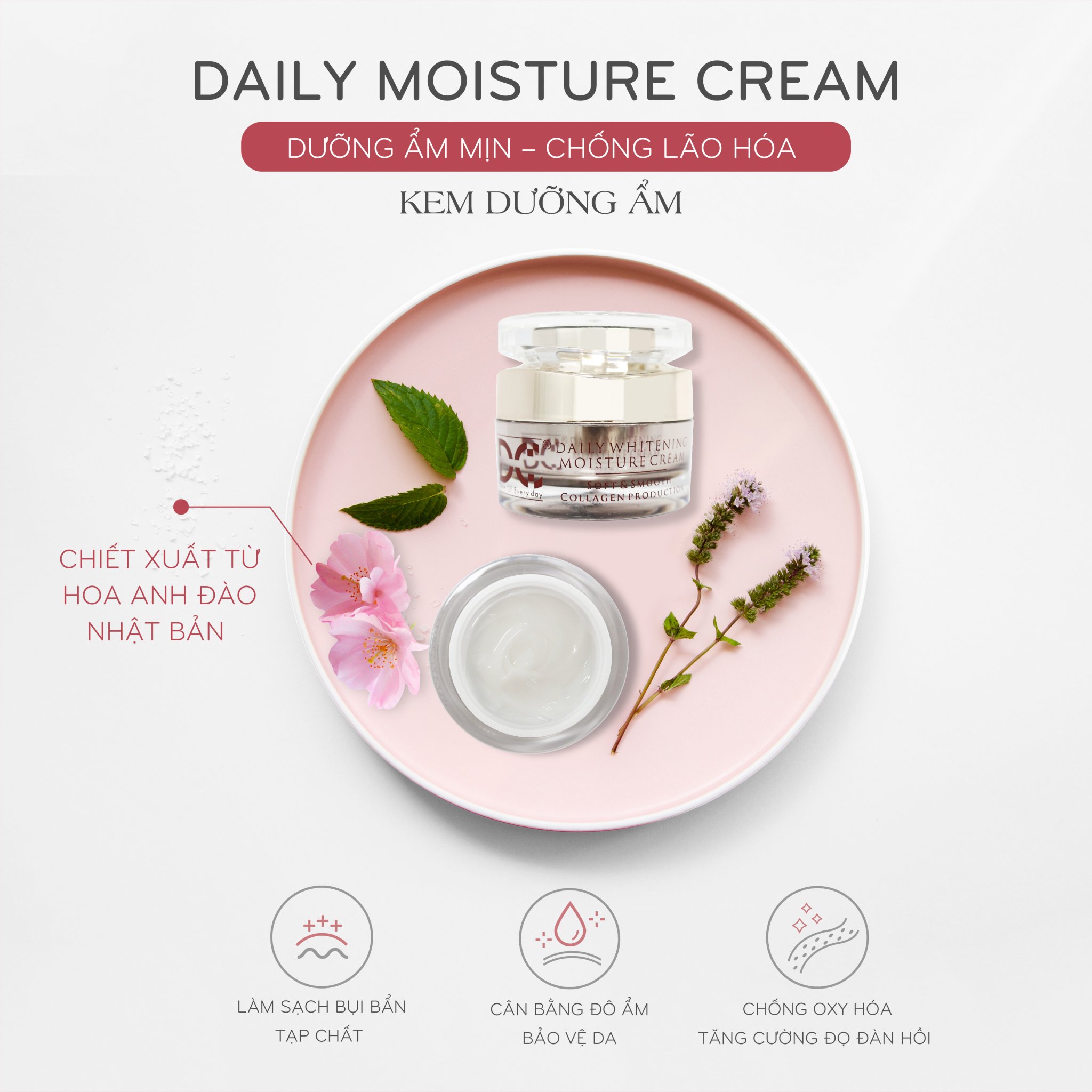 *Daily moisture cream Là kem dạng lỏng *Công dụng dưỡng trăng, cấp ẩm , duy trì độ đàn hồi cho da, khô, có dấu hiêu lão hóa. *Sữ dụng hàng ngày sẽ giúp da tái