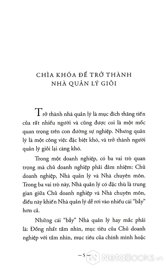Để trở thành nhà quản lý hiệu quả vạch ra con đường không chỉ làm tăng năng suất nhất thời mà còn hướng tới sự phát triển bền vững và lâu dài. Cuốn sách giúp các nhà quản lý hiểu được sự khác biệt rõ rệt có thể được tạo ra trong bất kỳ một doanh nghiệp nào thông qua việc sử dụng một hệ thống quản lý hiệu quả, từ đó từng bước đưa ra những hướng dẫn cụ thể để phát triển hệ thống này, trong đó nhấn mạnh việc tạo động lực và mang lại lợi ích trước hết cho chính các nhân viên.