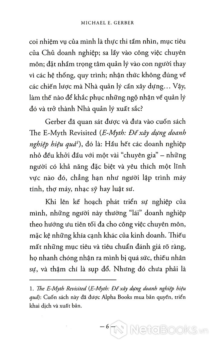 Michale E. Gerber đã làm thay đổi cuộc sống của hàng trăm nghìn các nhà quản lý doanh nghiệp nhỏ. Từ kinh nghiệm làm việc với hơn 15.000 các doanh nghiệp vừa và nhỏ, các tập đoàn lớn, tác giả đã khám phá ra tại sao nhiều nhà quản lý lại làm việc không hiệu quả và họ cần phải làm gì để khắc phục.
