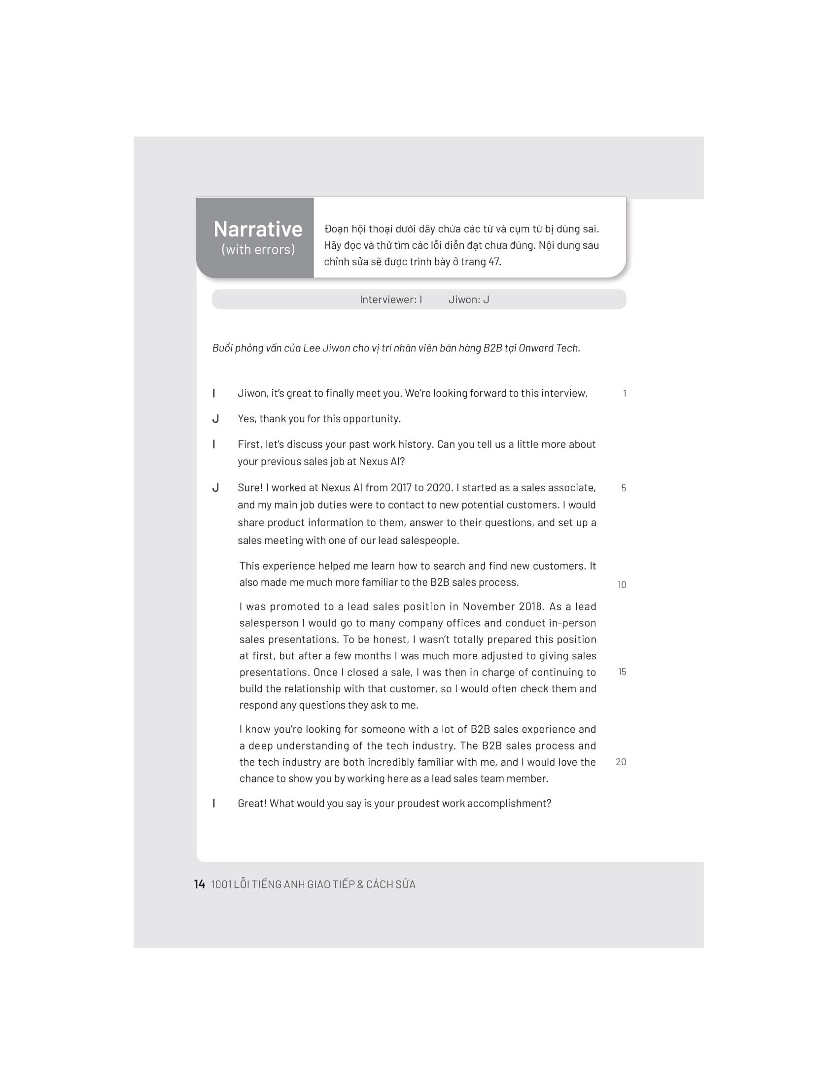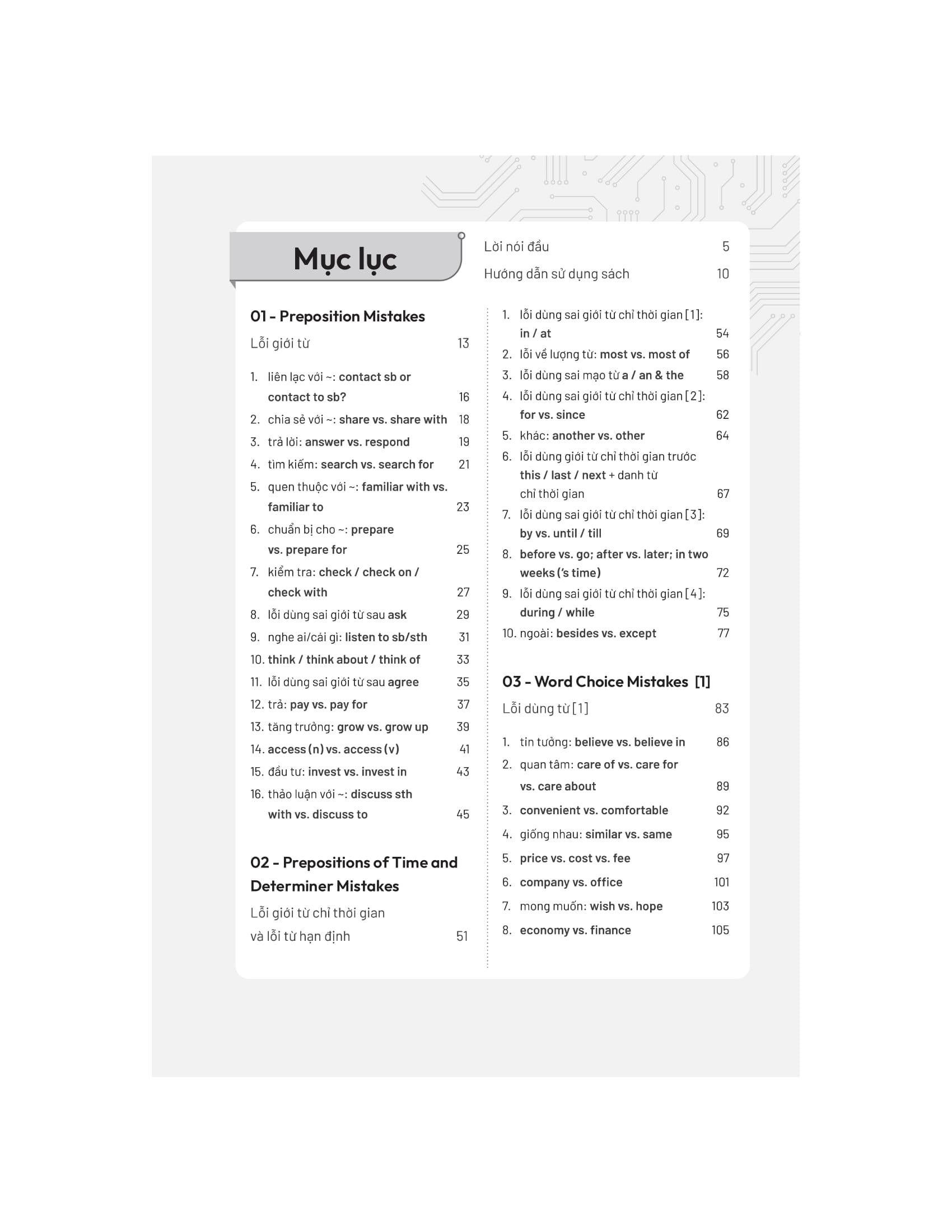 Sách được chia thành 10 chương, trong đó chương 1-9 tập trung vào các nhóm lỗi lớn mà người học tiếng Anh thường mắc phải, và chương 10 đưa ra các từ vựng tiếng Anh công sở phổ biến.