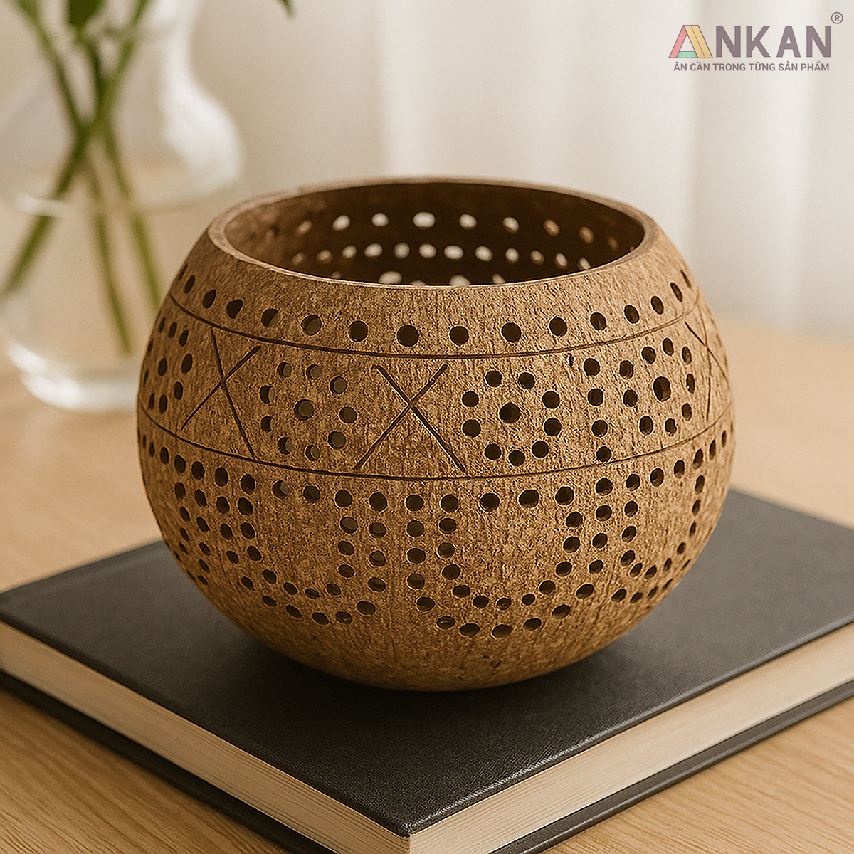 Bạn đang tìm một sản phẩm decor nhỏ gọn nhưng đủ tinh tế để tạo không gian thư giãn? Chiếc đèn gáo dừa khắc hoa văn hoa cúc của ANKAN là lựa chọn hoàn hảo