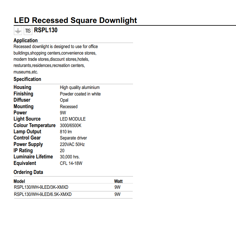 LED Downlight AT04L 90/9W Model: D AT04L 90/9W Wattage: 9W Voltage: 220V/50-60Hz Luminous Flux: 650lm / 630lm Color temperature Dimensions: (118x40)mm Mounting diameter: 90 mm